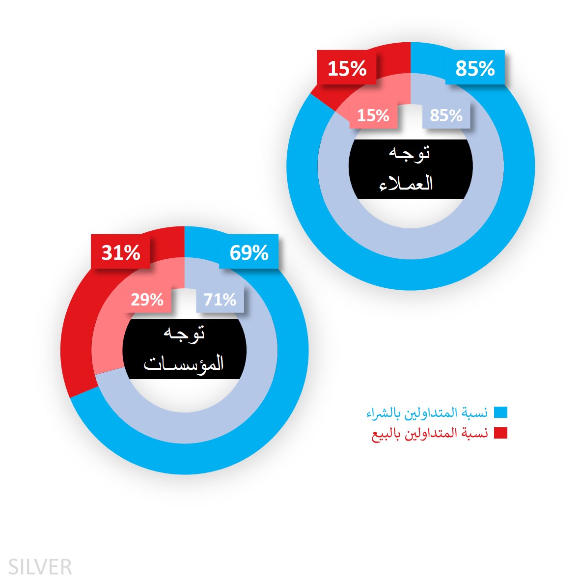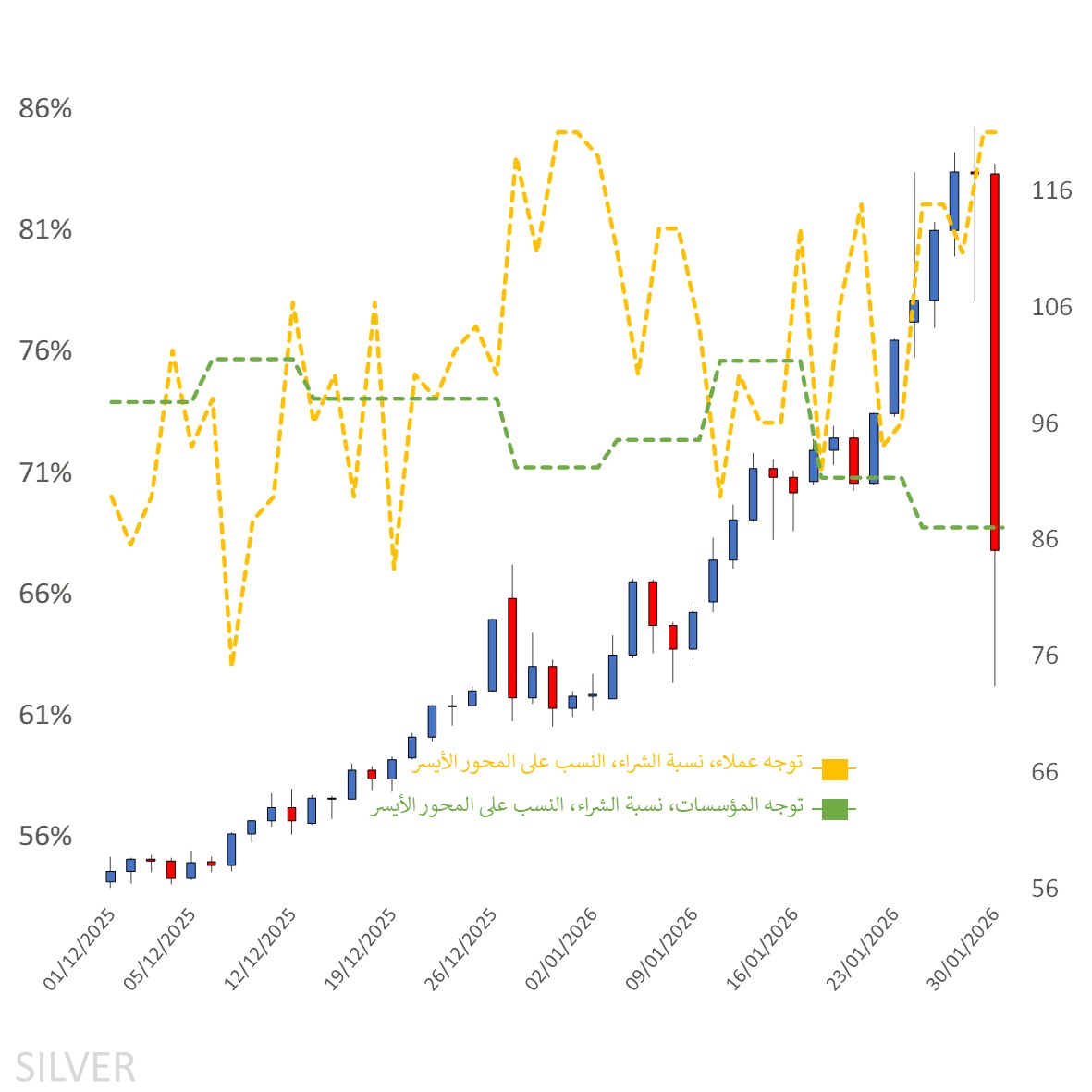تجاه الفضة بدأت معنويات العملاء هذا الأسبوع في منطقة شراء مفرطة عند 85%، دون تغيير عن يوم الجمعة الماضي قبل الانهيار، إلا أن الخسائر المستمرة دفعت بعض أصحاب المراكز الطويلة إلى الخروج، مما خفّض هذا الانحياز إلى 82% حتى وقت كتابة هذا التقرير. وعند إسقاط المعنويات على الرسم البياني أدناه، نلاحظ أن أصحاب المراكز الشرائية كانوا يبحثون عن فرصة للتخارج مع الصعود الأولي للسعر قبل محاولة اللحاق بالاتجاه، وفي بداية الأسبوع الماضي كانت المعنويات الشرائية الثقيلة عند 73%.
