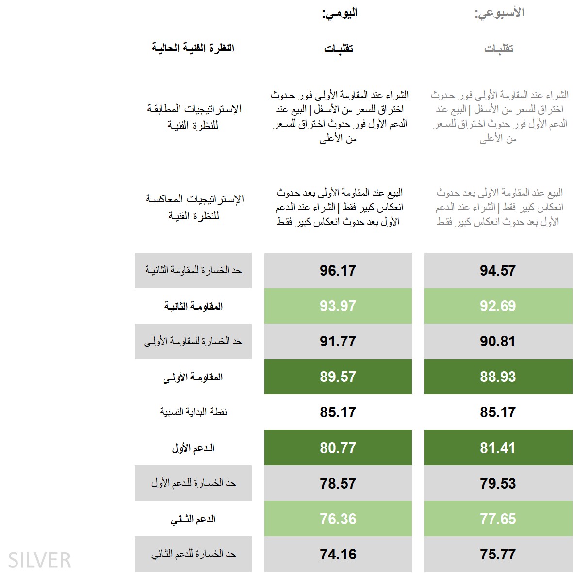 النظرة الفنية للفضة، الاستراتيجيات والمستويات