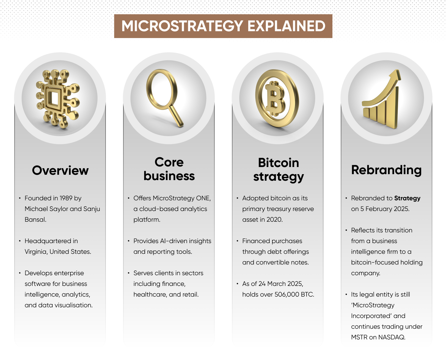 تاريخيًا، عملت MicroStrategy ضمن قطاع التكنولوجيا، حيث قدمت برمجيات ذكاء الأعمال والتحليلات. ولكن منذ عام 2020، تحول تركيزها الأساسي نحو تراكم حيازات البيتكوين، حيث تمتلك الشركة الآن ما يزيد عن 506,000 وحدة بيتكوين اعتبارًا من 24 مارس 2025.