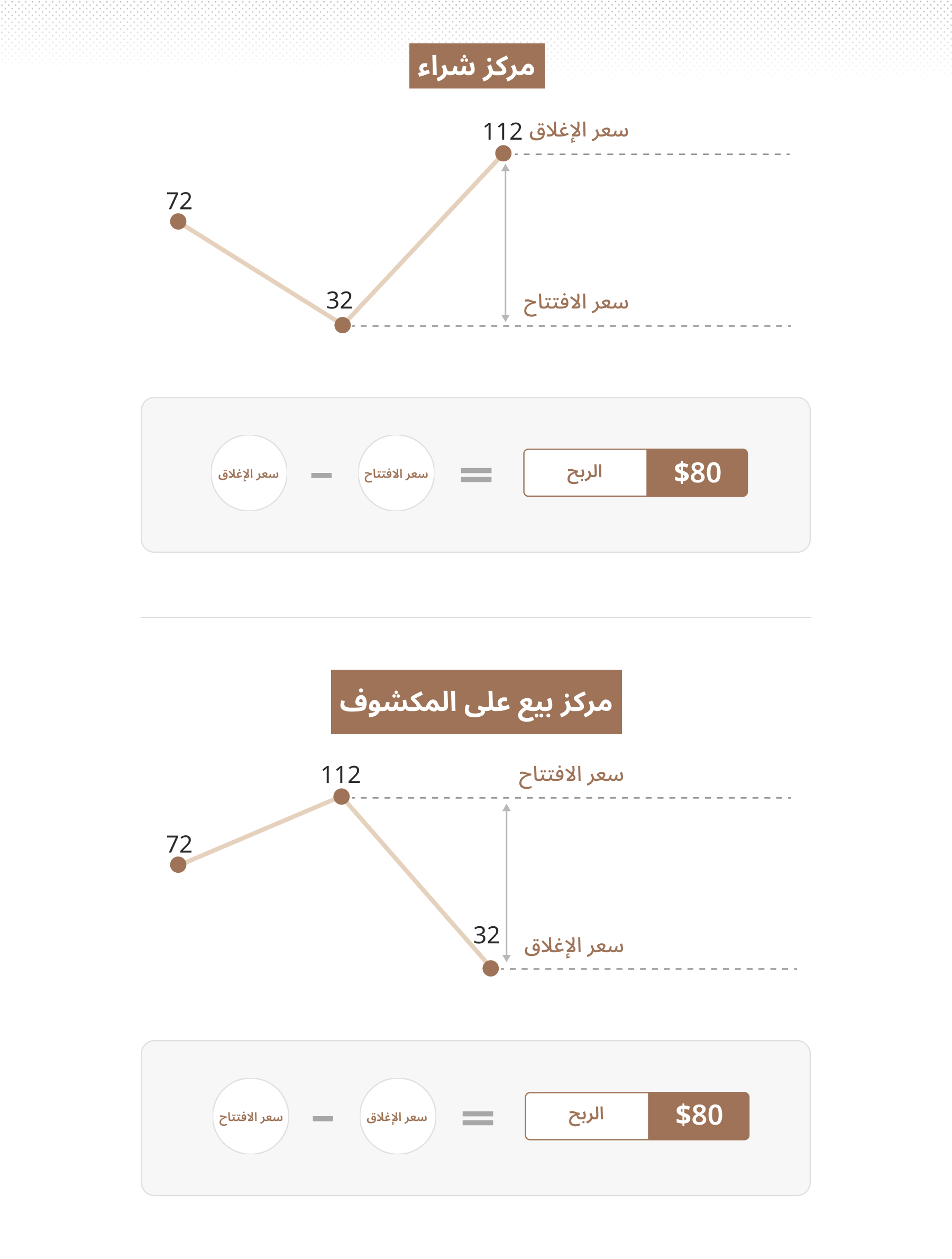 باستخدام عقود الفروقات، يمكنك فتح صفقة شراء توقعًا لارتفاع سعر الأصل، أو صفقة بيع على المكشوف توقعًا لانخفاضه. ولكن يجب الانتباه إلى أن الرسوم التوضيحية المعروضة قد تظهر سيناريوهات الربح المحتمل فقط – فإذا تحرك السعر في الاتجاه المعاكس للتوقعات، ستترتب على ذلك خسائر مالية.