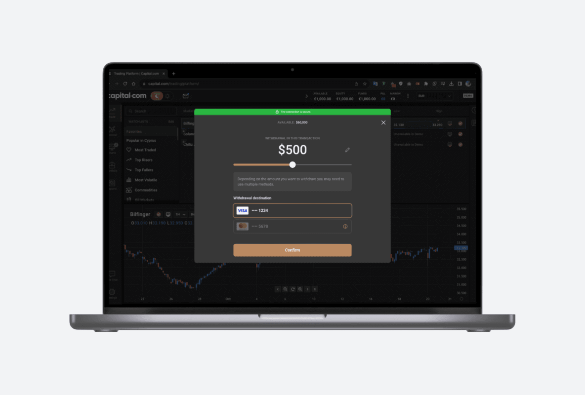 احصل على أموالك وقتما تشاء وبكل سهولة. استمتع بعملية سحب سريعة – فنحن نقوم بمعالجة 99٪ من طلبات السحب في غضون 24 ساعة و99٪ منها في غضون ساعة واحدة (وفقًا لبيانات خادم Capital.com العالمي، 2024).