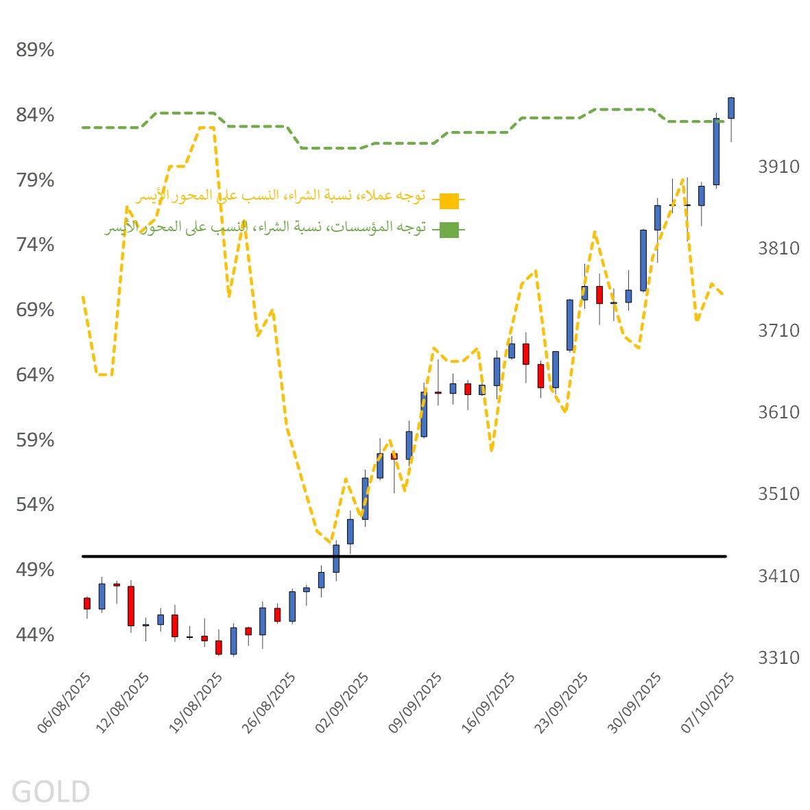 أما بالنسبة لمضاربي تقرير التزامات المتداولين (Commitment of Traders – CoT) الصادر عن هيئة CFTC، فلم تُنشر بيانات الأسبوع الماضي بسبب الإغلاق الحكومي الأميركي، لكن الأرقام من الأسبوع الذي سبقه تُظهر استمرار الانحياز القوي للشراء عند مستوى قريب من الذروة السابقة (84%)، حيث زادت العقود الطويلة بـ 6,030 عقدًا مقابل زيادة أقل في العقود القصيرة بـ 5,691 عقدًا، دون تغيير يُذكر في النسب المئوية.