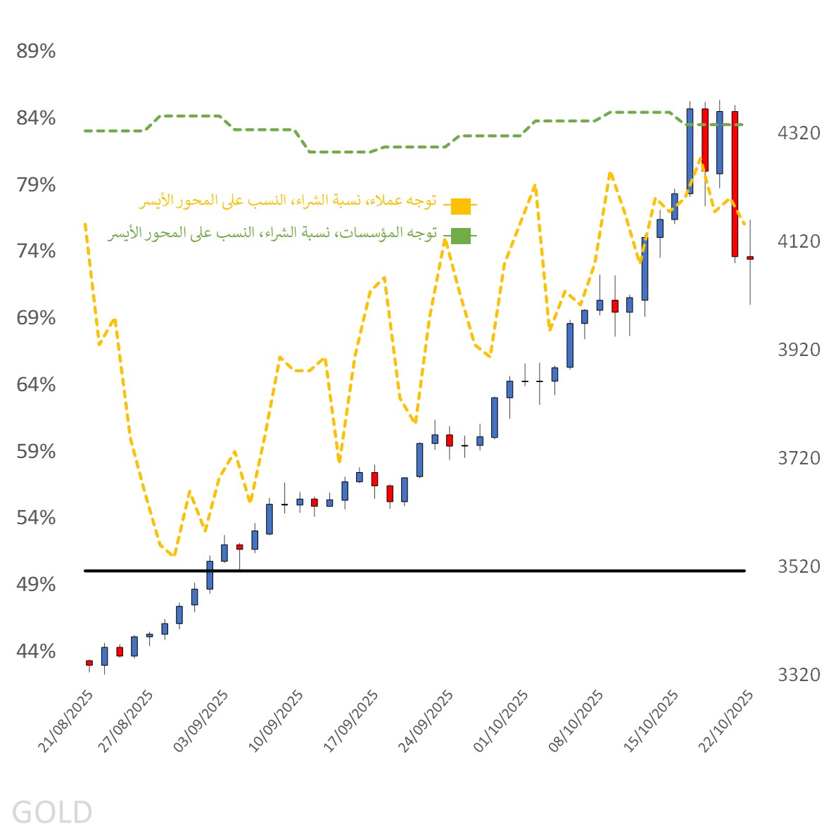 وبسبب الإغلاق الحكومي الأمريكي، لم تصدر تقارير مراكز المتداولين (CoT) عن هيئة CFTC، إلا أن آخر تقرير متاح أظهر أن المضاربين الكبار (Large Speculators) لا يزالون يحتفظون بمراكز شراء صافية (Net Long Bias)، معظمها فُتح عند مستويات أقل بكثير من الأسعار الحالية.