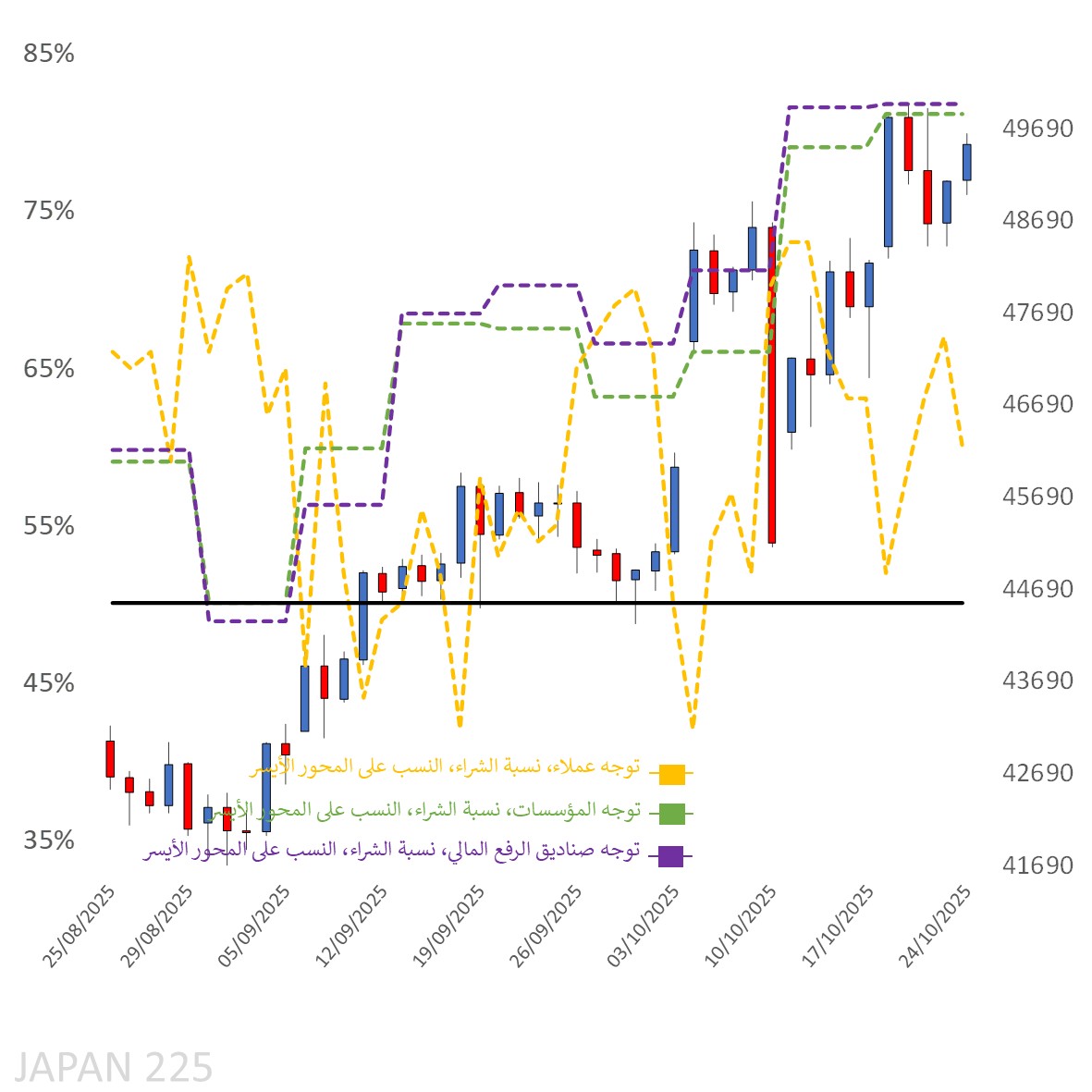 تبقى النظرة الفنية لمؤشر نيكاي 225 الياباني إيجابية على كل من الإطارين اليومي والأسبوعي، فيما تشير المعنويات إلى أغلبية مراكز شراء بين المتداولين.