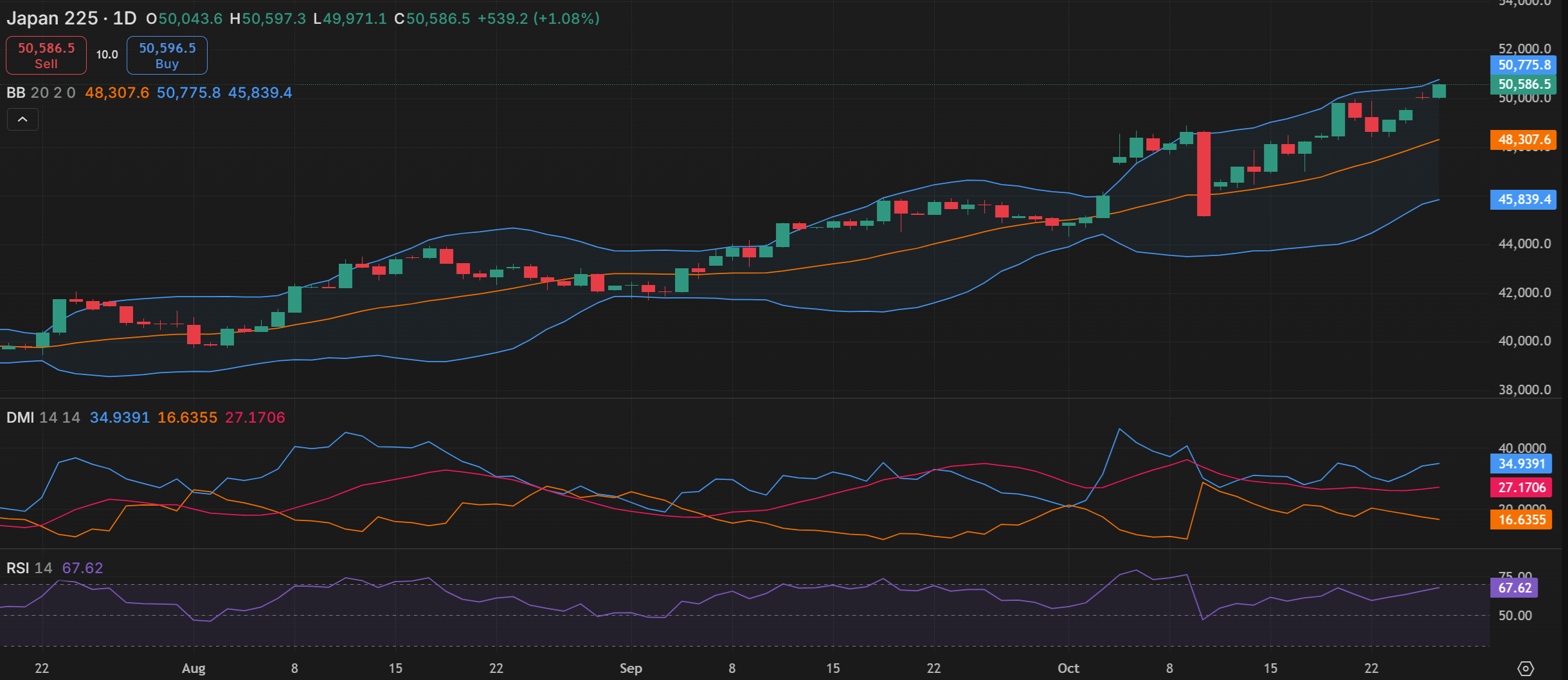 الرسم البياني لمؤشر نيكاي 225 على منصة Capital.com مع أبرز المؤشرات الفنية