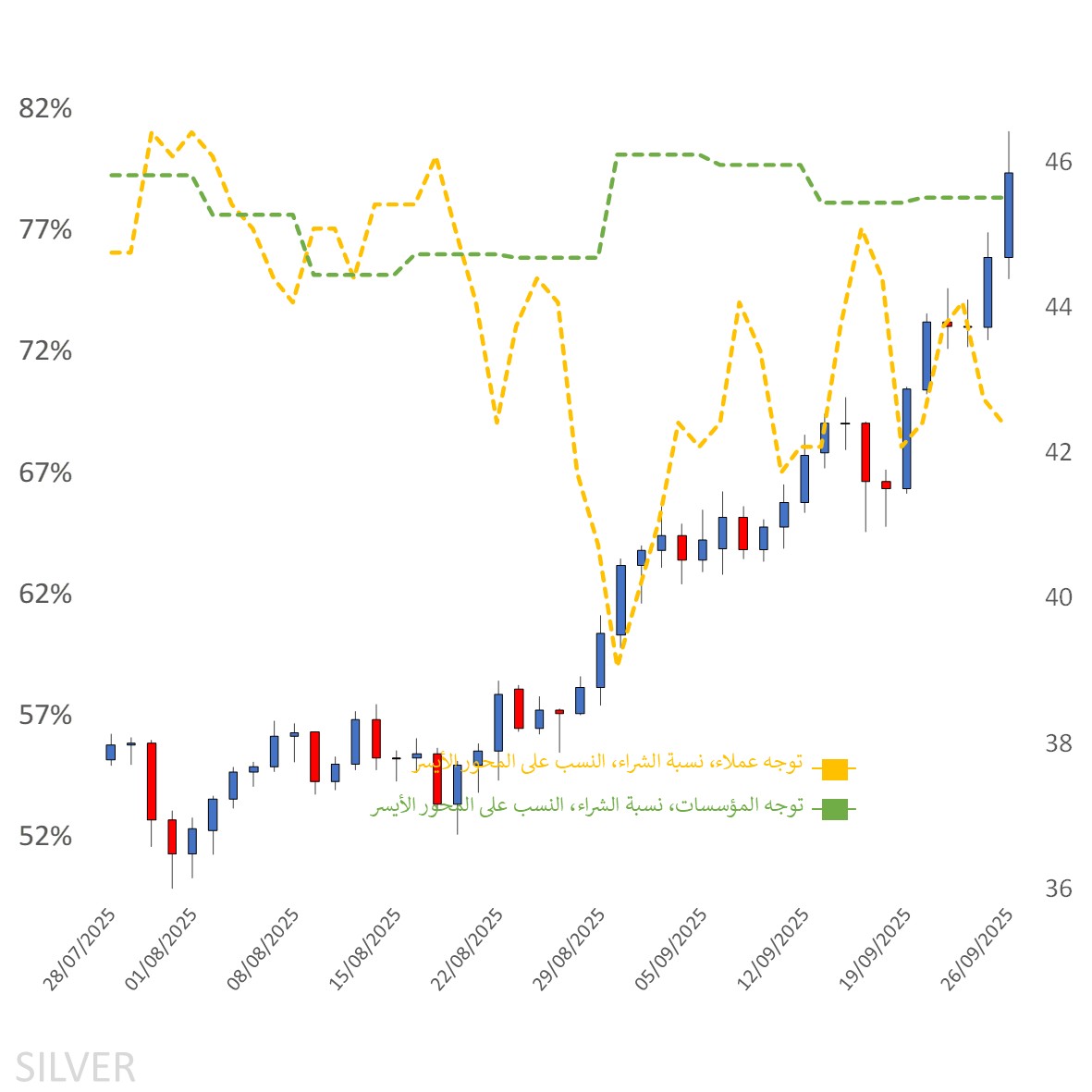 بالنسبة للمضاربين في CoT: يظل في صافي شراء قوي وفقًا لتقرير CFTC الأخير، حيث ارتفعت عقود الشراء +695 عقدًا مع تراجع طفيف في عقود البيع (-43)، ما أبقى نسبة الشراء عند 78%.