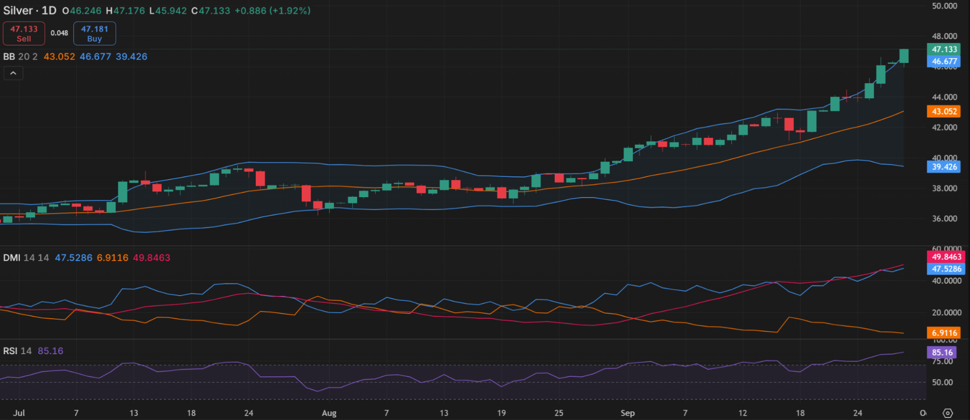 سجّل الذهب صباح اليوم مستوى قياسيًا جديدًا متجاوزًا 3,800 دولار وبأكثر من 1% صعودًا، لكن الفضة، شقيقه النفيس، تفوّق عليه بارتفاع يتجاوز 2% ليصل إلى 47 دولارًا للمرة الأولى منذ عام 2011. وقد ارتفع بنسبة مذهلة بلغت 18% حتى الآن هذا الشهر مع اقتراب نهاية سبتمبر، مما يعني تسجيل خمسة أشهر متتالية من المكاسب. كما أن نسبة الذهب إلى الفضة استأنفت انخفاضها وكَسرت لفترة وجيزة مستوى 81، لتسجل أدنى مستوياتها منذ أكتوبر.