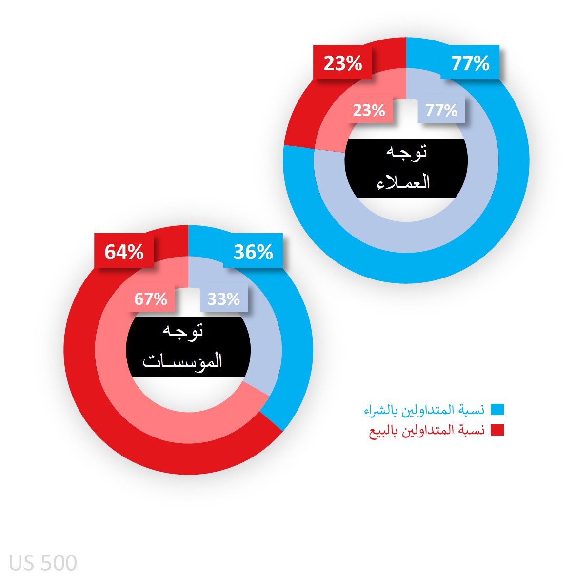 كما يتخذ معظم العملاء مراكز شراء في مؤشر داو جونز (73%)، وناسداك (64%)، وراسل (66%)، لكنها أقل من نظيرتها في ستاندرد آند بورز 500 الذي يحتفظ بأعلى نسبة انحياز للشراء.