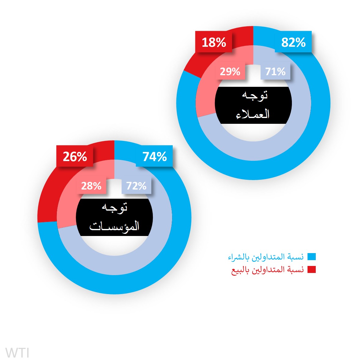 كانت المعنويات تميل بقوة إلى الشراء بنسبة 71% أواخر الأسبوع الماضي، لكنها دخلت صباح اليوم منطقة الشراء المفرط مع دخول مراكز شرائية جديدة، بعكس السلوك السابق الذي شهد جني أرباح عند الارتفاع وإعادة الدخول عند التراجع.