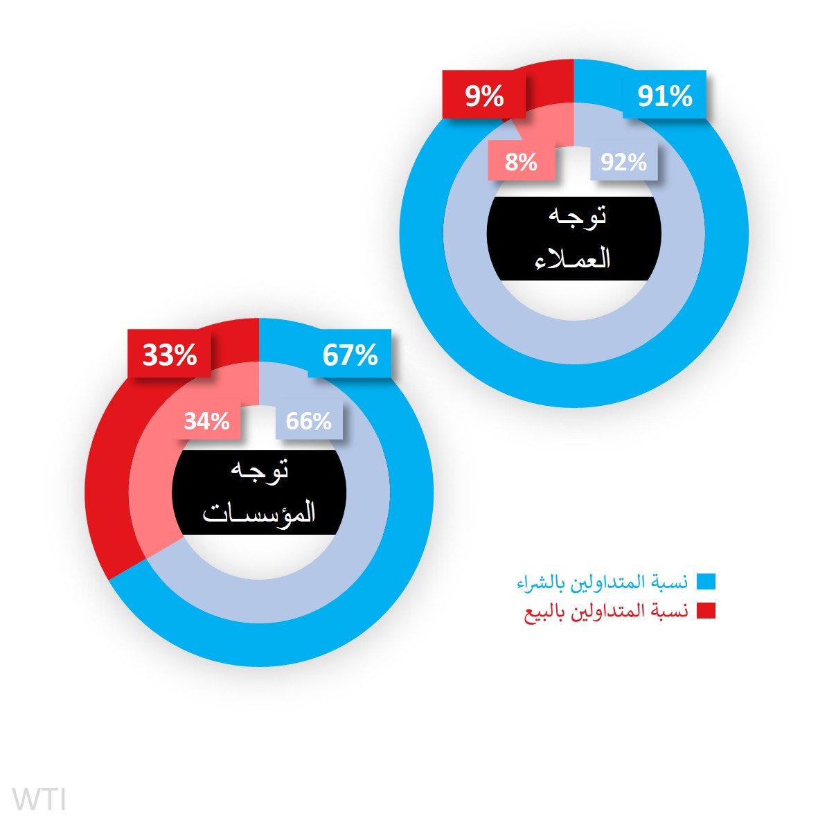 لا تزال معنويات عملاء Capital.com مائلة بشكل واضح نحو الشراء منذ أشهر، حيث بقيت المراكز الطويلة في مستويات مرتفعة جدًا تاريخيًا نتيجة انخفاض أسعار WTI خلال الأشهر الماضية، مما دفع المتداولين إلى إغلاق صفقات البيع والاحتفاظ بالصفقات الطويلة أو فتح المزيد منها.
