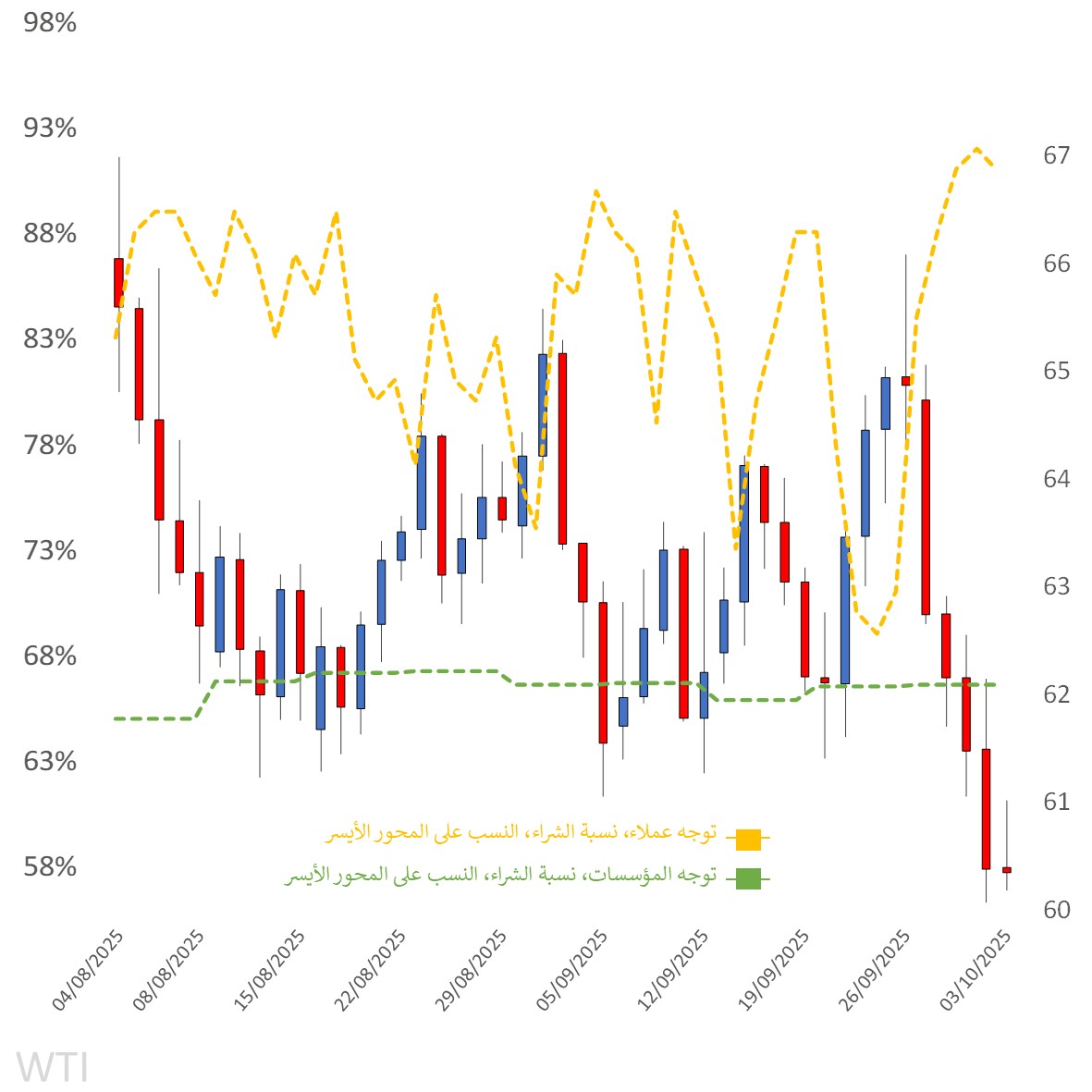 افتتح خام غرب تكساس الأسبوع بفجوة صعودية نحو 61 دولارًا، إلا أنه لم يغير بعد الصورة الفنية السلبية السائدة، بينما تشير معنويات المتداولين إلى استمرار هيمنة مراكز الشراء.