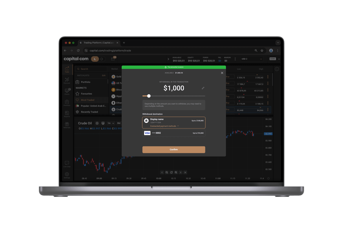 Bringen Sie Ihr Geld mühelos dorthin, wo Sie es brauchen. Schnell auszahlen lassen - wir bearbeiten 99 % der Auszahlungen innerhalb von 24 Stunden, und 94 % innerhalb einer Stunde (Capital.com Global Server Data, 2024).