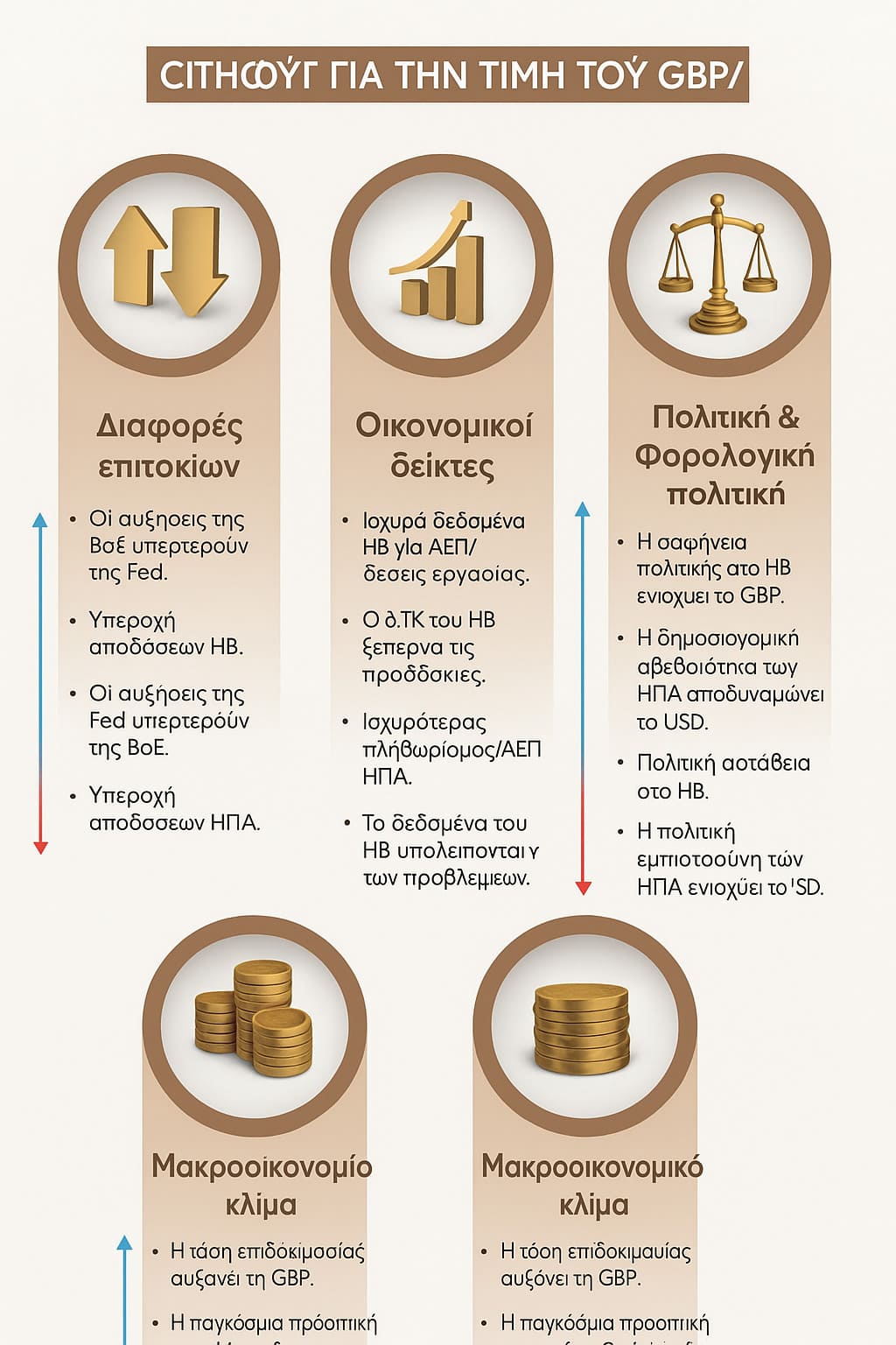 Επιτόκια που καθορίζονται από την Τράπεζα της Αγγλίας (BoE) και την Τράπεζα των ΗΠΑ. Η Ομοσπονδιακή Τράπεζα των ΗΠΑ (Fed) μπορεί να επηρεάσει άμεσα την τιμή του GBP/USD. Οι μεταβολές των σχετικών επιτοκίων μεταξύ των δύο κεντρικών τραπεζών επηρεάζουν συνήθως τη ζήτηση – τα υψηλότερα επιτόκια τείνουν να προσελκύουν επενδυτές που αναζητούν καλύτερες αποδόσεις. Για παράδειγμα, εάν η Fed αυξήσει τα επιτόκια ενώ η BoE τα διατηρήσει σταθερά, η ισοτιμία GBP/USD θα μπορούσε να υποχωρήσει καθώς θα αυξηθεί η ζήτηση για το δολάριο ΗΠΑ. Αντίθετα, αν η BoE σηματοδοτήσει αυξήσεις των επιτοκίων πριν από την Fed, το GBP/USD ενδέχεται να ενισχυθεί.