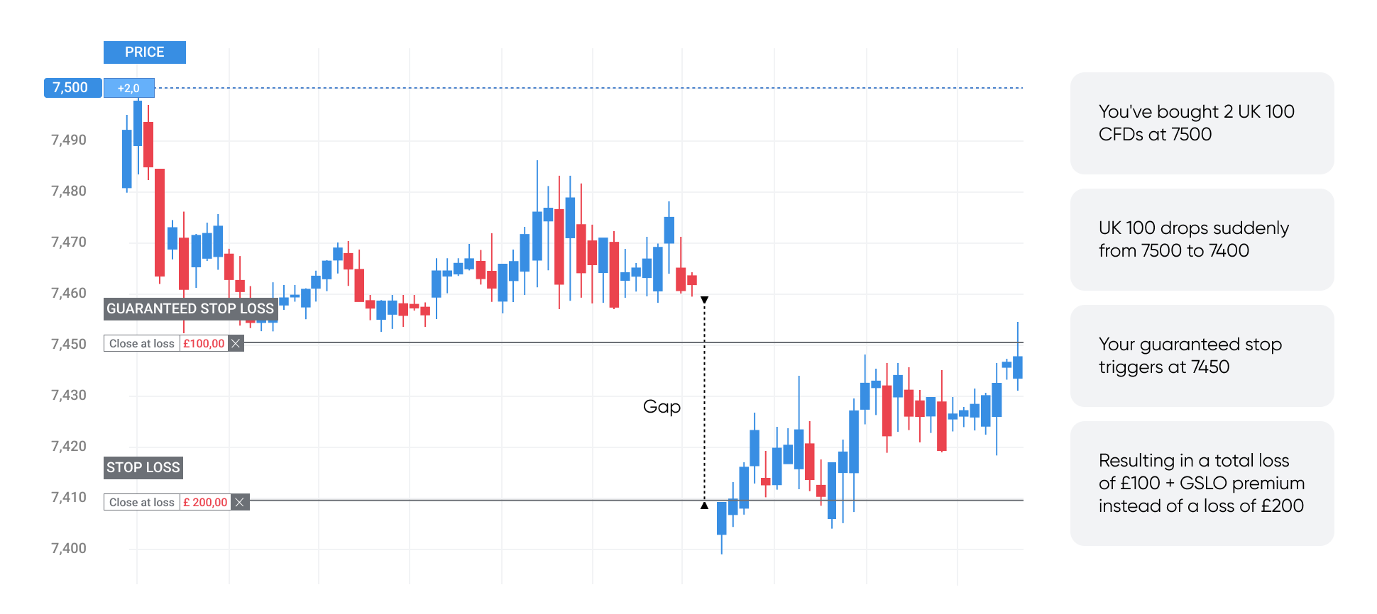 Meanwhile, a guaranteed stop-loss order, or GSLO, is a type of stop that guarantees closing a trade at a certain price, regardless of slippage or market gaps. While GSLOs can provide assurance that your trade will be executed at the price you expect, it’s important to note that they also incur a fee (premium) if triggered. Below is an example of a GSLO compared to a standard stop.