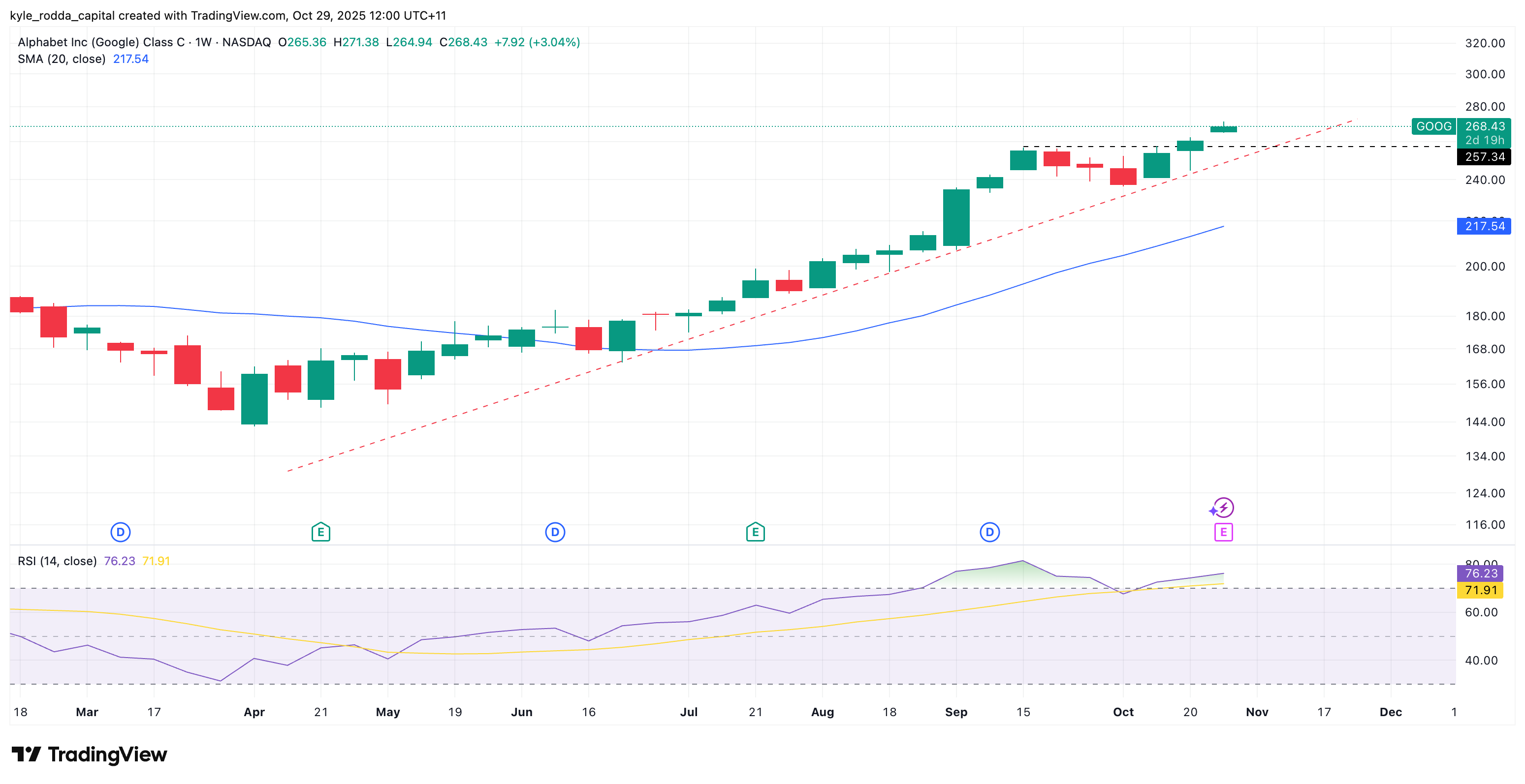Alphabet’s Q3 2025 earnings are expected to highlight stable growth across its core businesses, with adjusted EPS forecast at $2.68 and revenue of $85.1 billion. That represents annual revenue growth of roughly 14%, driven by sustained momentum in YouTube and cloud services, offsetting gradual saturation in traditional search advertising. The company’s investments in AI infrastructure and Gemini-integrated search tools are central to future growth, though near-term returns remain modest as monetisation models evolve. Past quarters have been supported by disciplined cost control and resilience in digital ad demand, while the outlook hinges on whether Alphabet can balance AI innovation with profitability. Investors will watch closely for commentary on cloud growth, AI deployment in Google Workspace, and ad-market share retention as generative AI reshapes the competitive landscape.