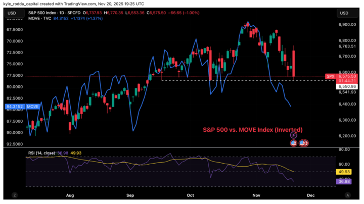 The sell-off in global markets is fundamentally a function of monetary policy uncertainty. There’s definitely a big overlay of tech valuations becoming too stretched amid legitimate concerns about the returns on massive investments in artificial intelligence. But for the most part, this sell-off in equities, Bitcoin and other assets (even including gold) comes because the markets aren’t sure what the US Federal Reserve will do with monetary policy in December and beyond. You can see the dynamic in the relationship between implied volatility in the bond market – itself mostly, though not entirely, a reflection of monetary policy expectations – and US indices. Below, for example, is the MOVE Index (the VIX of the bond market) overlaid onto the S&P 500.
