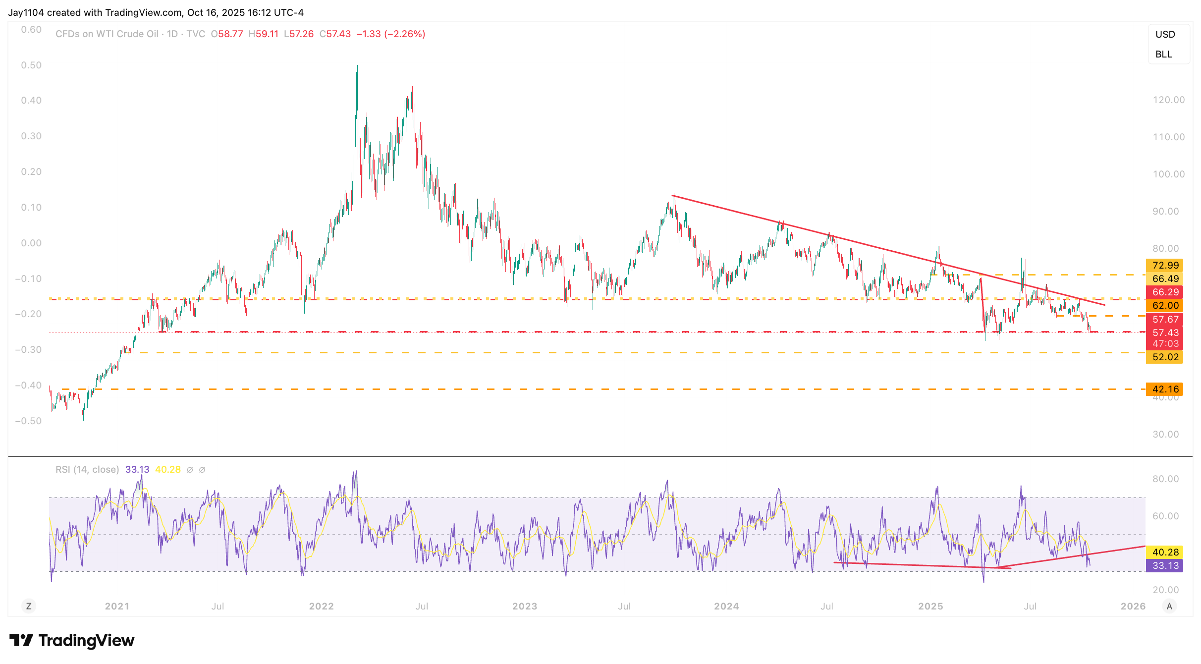 The KBW Regional Bank ETF (KRE) fell by more than 6% after Western Alliance and Zions Bank announced they were exposed to alleged borrower fraud, raising concerns about the health of the sector. The ETF dropped below support around $59.5 and continued to fall to roughly $57.6, followed by an end-of-day bounce. The next significant level of support does not appear until around $55.5. At present, the RSI is trading near 31, suggesting the ETF could decline further, and has not reached oversold levels yet.