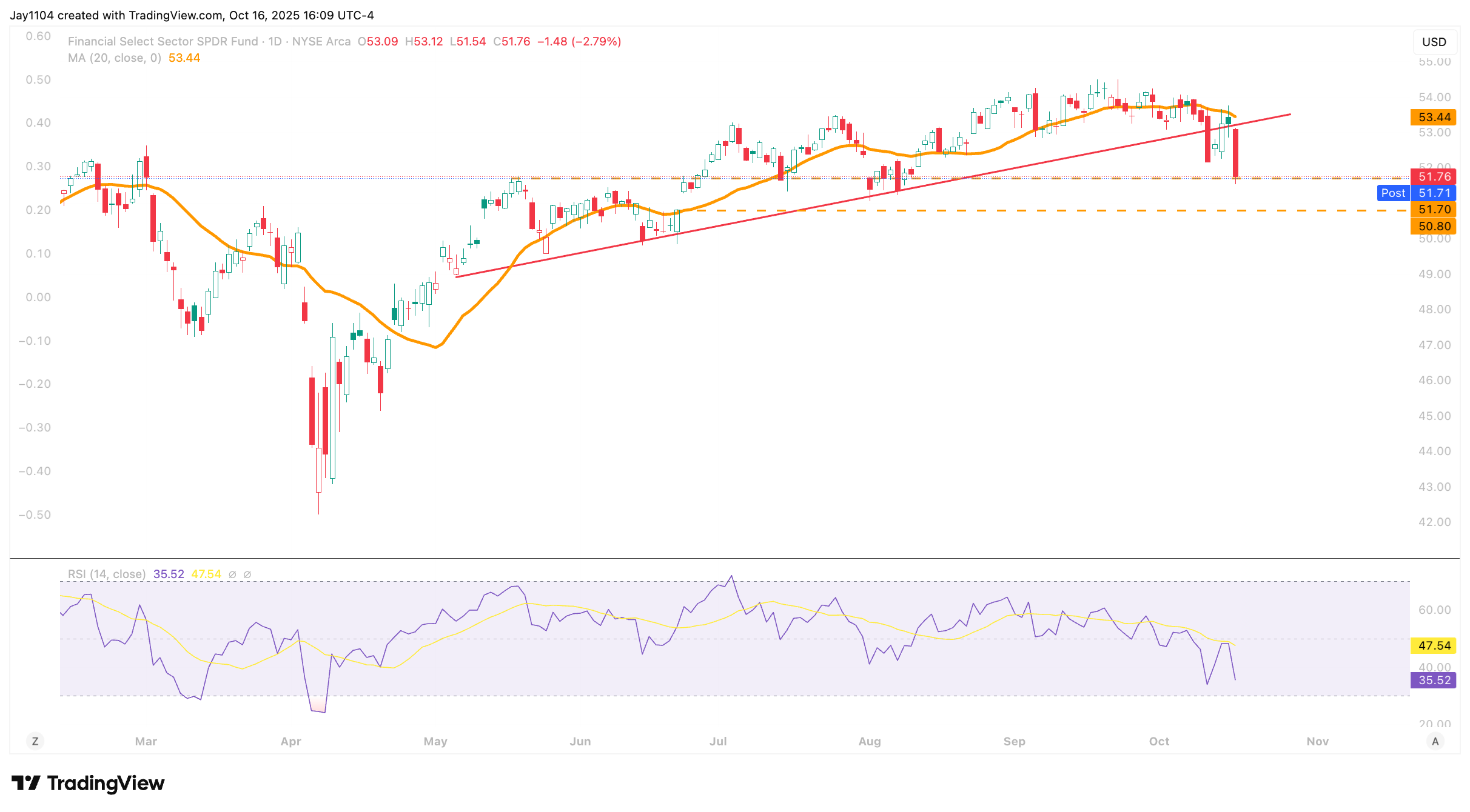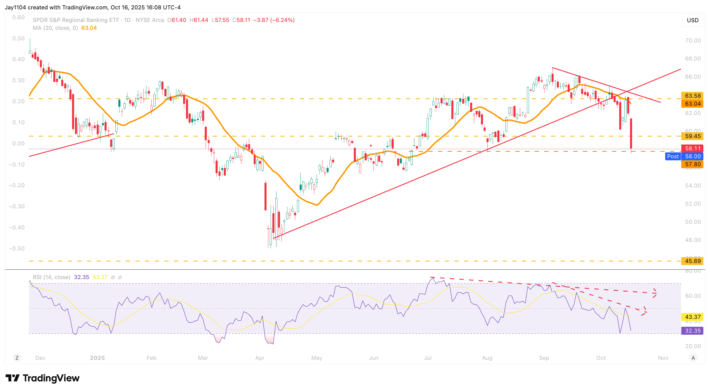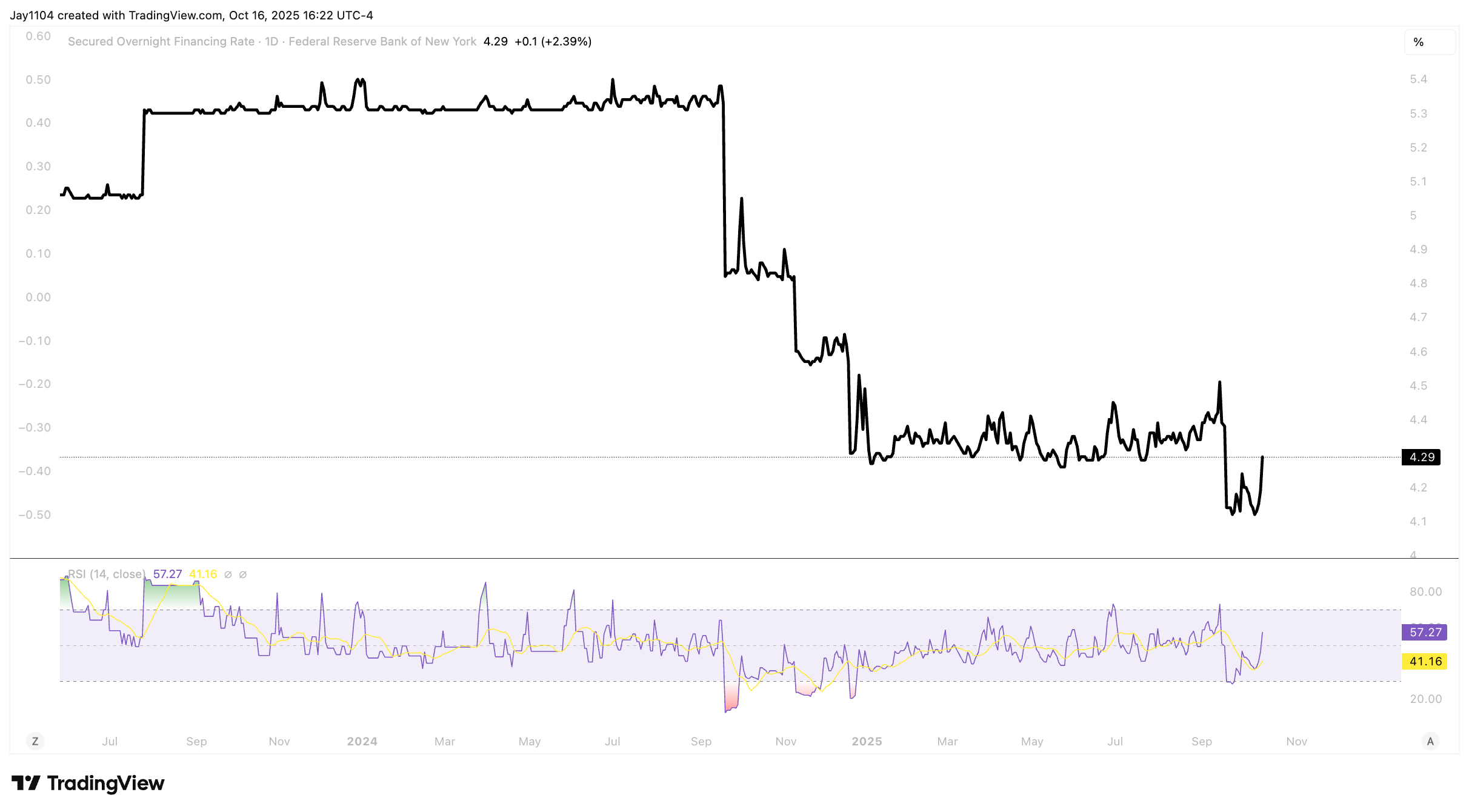 The S&P 500 fell by around 60 basis points on Thursday, 17 October. The market appears to be experiencing a significant drain in liquidity, as the overnight Secured Overnight Financing Rate surged to 4.29% — a sign that liquidity conditions are tightening and may be weighing on assets such as stocks as well as Bitcoin. Regional banks also continued to come under tremendous pressure as credit concerns mounted.