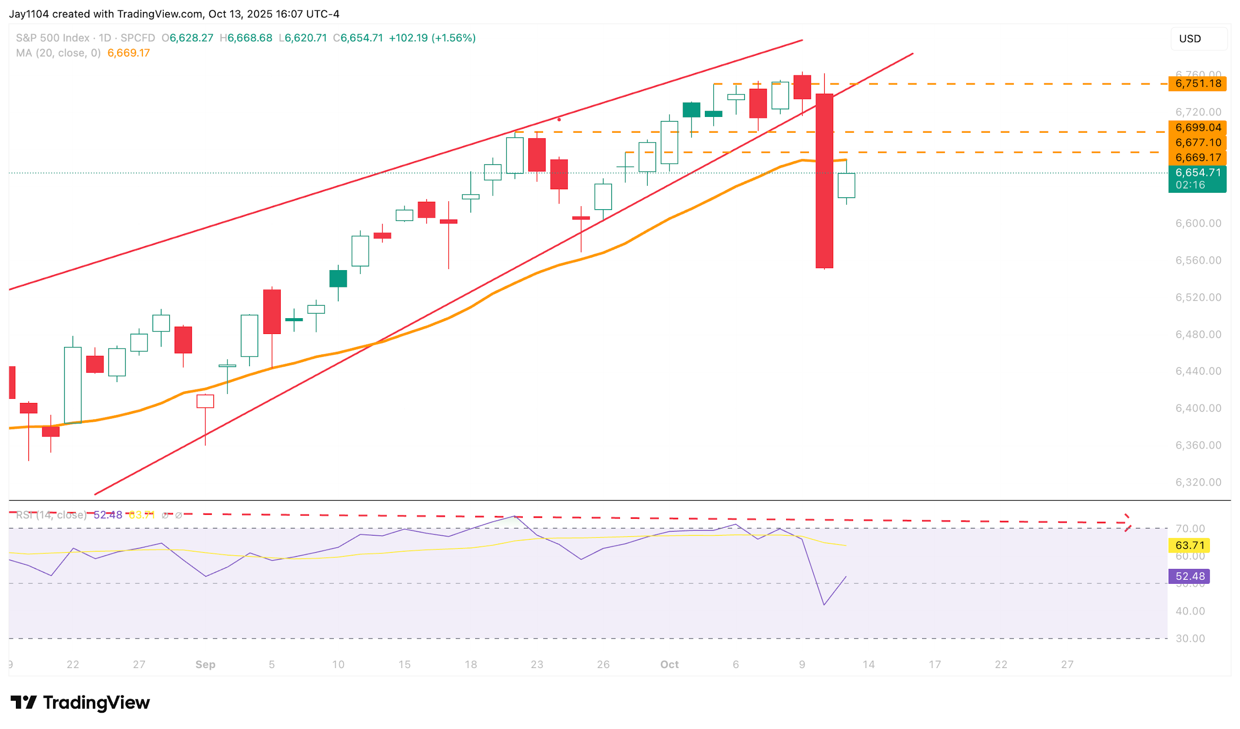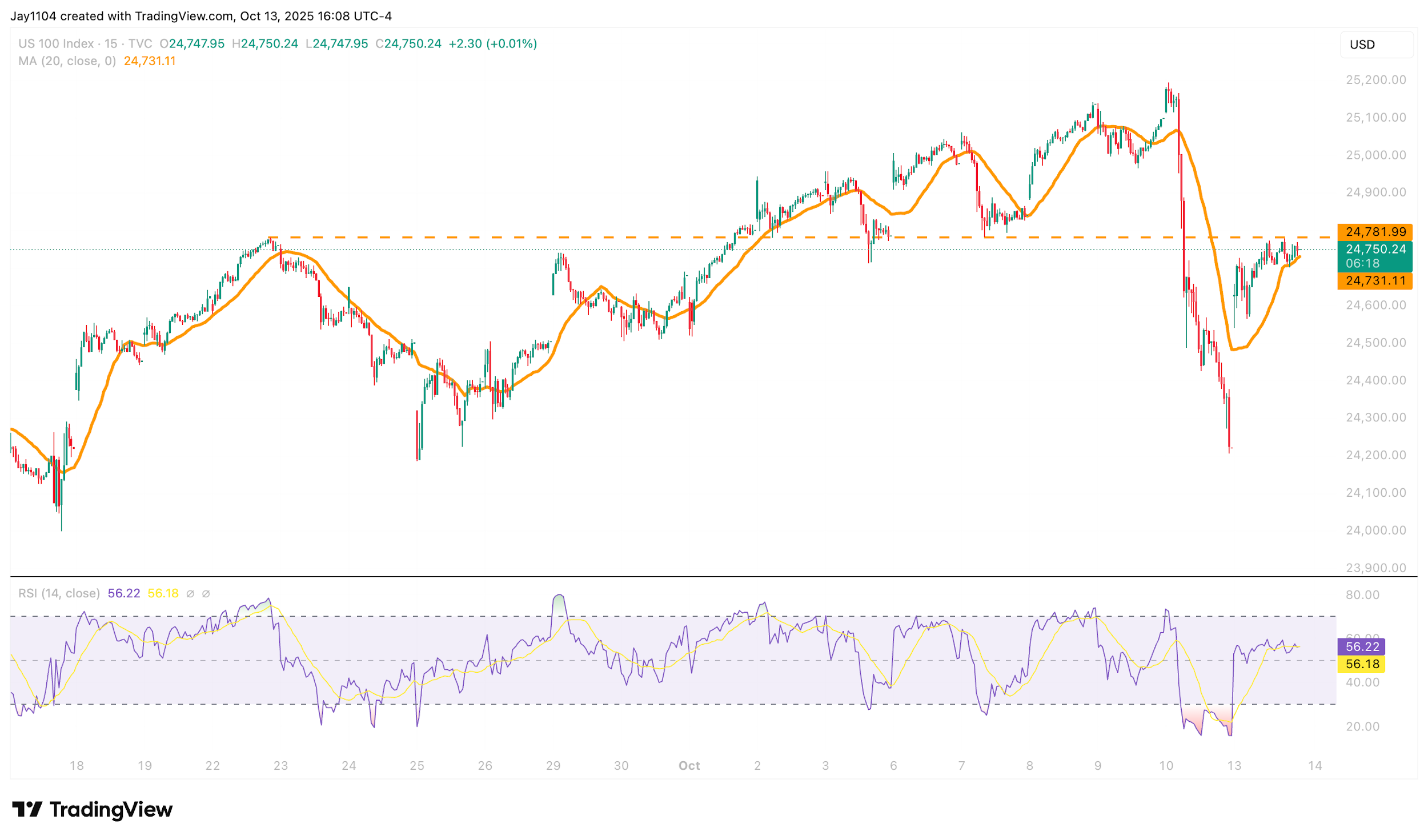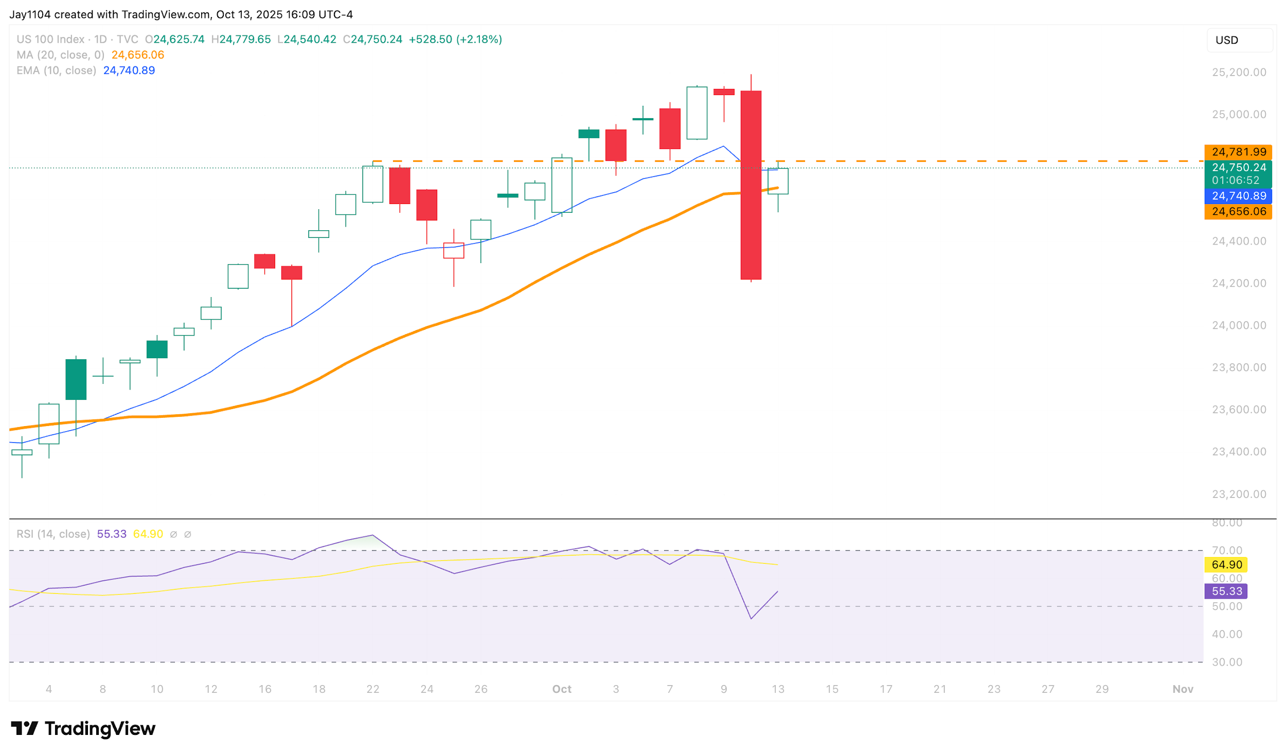 US markets rebounded on Monday, 13 October, following Friday’s sharp sell-off. Attention now turns to Tuesday, 14 October, when FOMC Chairman Jay Powell is scheduled to speak at the National Association for Business Economics Annual Meeting at 11:20 a.m. ET, with the lead-up to that event potentially prompting heightened market volatility.