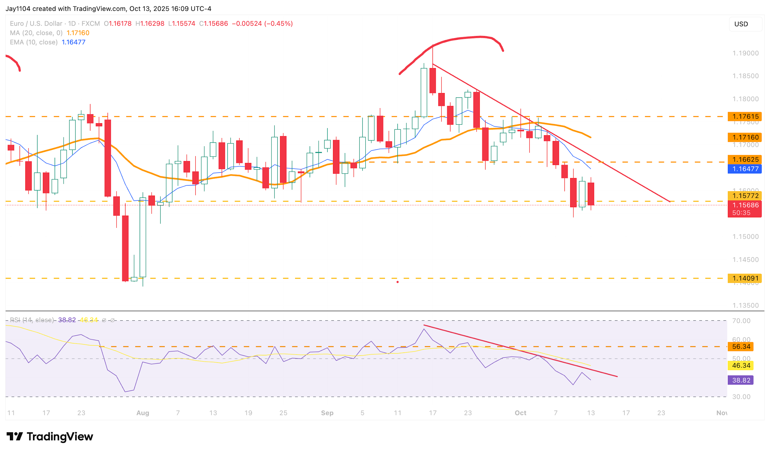 After strengthening on Friday, 9 October, the euro weakened against the dollar today by around 43 basis points, bringing it back to support near 1.1571. This places the euro in a position where it could break below that support level and decline towards 1.14.