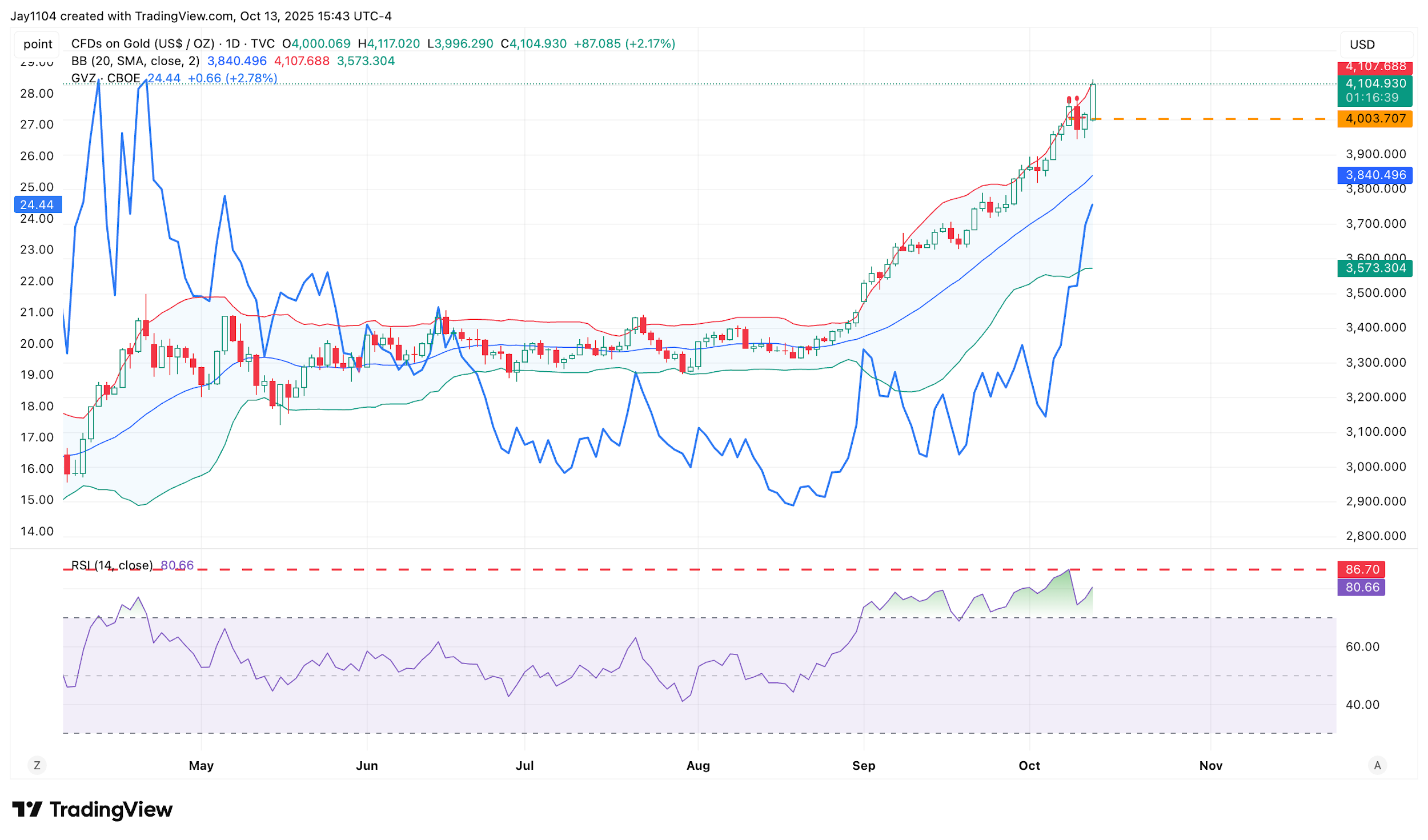 Gold continues to climb higher and is now in an overbought position, with the price trading above the upper Bollinger Band and the RSI once again above 80. Additionally, the GVZ, the gold volatility index, has also risen sharply.