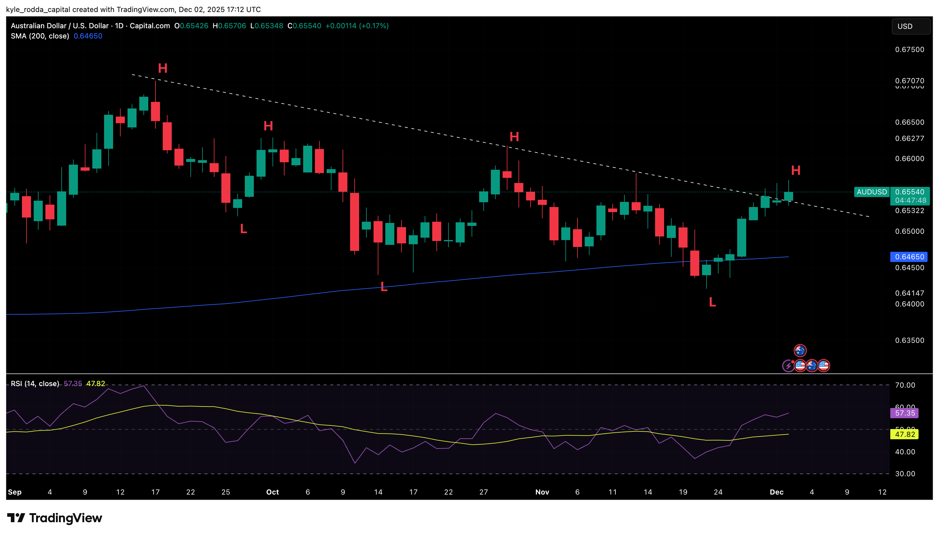 For the AUD/USD, the GDP result will be an important catalyst. A stronger-than-expected print reinforcing the hawkish repricing could offer support to the currency, particularly if US yields stabilise. But a weak outcome — or signs that household momentum is fading again — would likely unwind some of the tightening premium now priced into the curve and weigh on the Aussie heading into year-end.