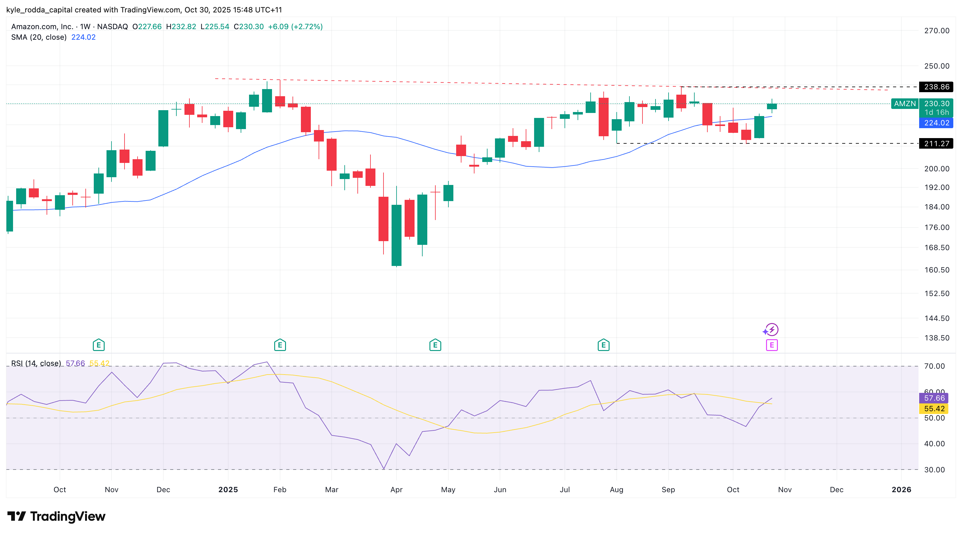 Amazon’s third-quarter results are projected to show continued improvement across its core business lines, with adjusted EPS of $1.97 and revenue of $177.8 billion. The focus will be on Amazon Web Services, where investors are watching for signs of re-acceleration after roughly 17.5% year-on-year growth last quarter. A move back toward the 20% growth threshold could provide an upside catalyst, particularly if margins remain firm. Advertising continues to be a standout, expanding around 22% last quarter on the back of Prime Video’s growing ad momentum—a trend expected to persist into the holiday season. Retail operations are also drawing attention, with analysts monitoring whether improving logistics efficiency continues to support margins. Meanwhile, heavy AI-related capital expenditure remains a double-edged sword: spending is tracking toward record levels in 2025, but markets will look for evidence that these investments are translating into stronger free cash flow.