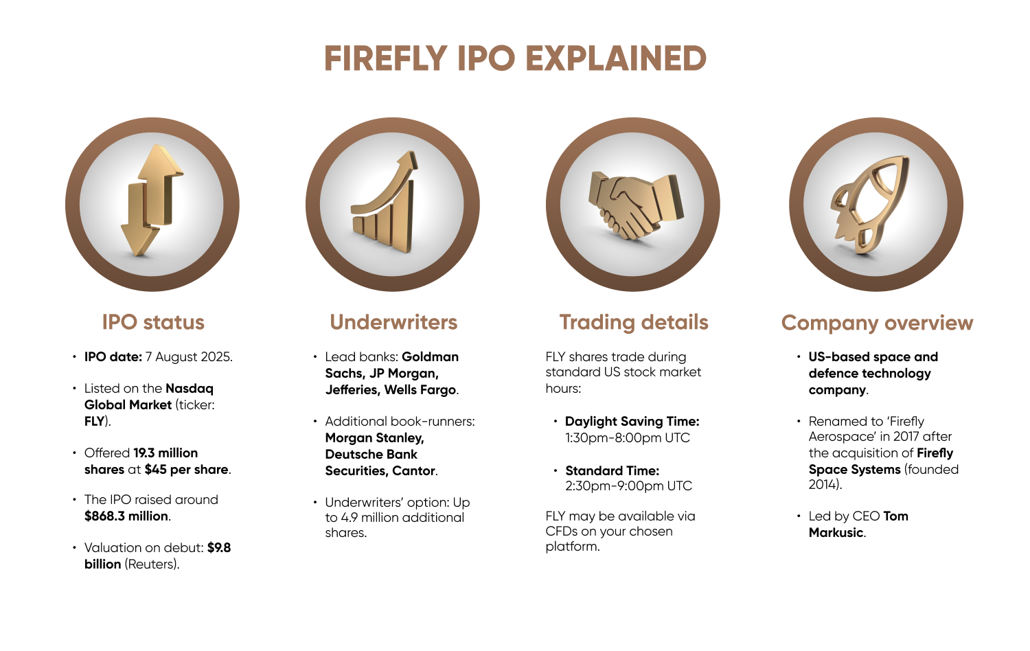 Explore Firefly Aerospace and its 2025 IPO, with information on its Nasdaq Global Market listing on the US stock market, FLY trading hours, and how to trade aerospace share CFDs.
