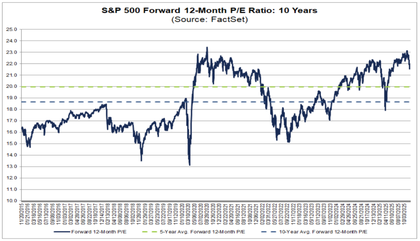 The S&P 500 remains richly valued, historically speaking. However, valuations moderated throughout the earnings period, courtesy of the upward revisions to the earnings outlook and the drop in stock prices seen throughout November. The S&P 500’s Forward 12-Month P/E Ratio fell from above 23 and levels reminiscent of the COVID bubble and Dot.com boom, to a still high but less extreme 21.5*.
