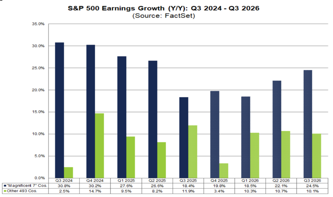 The Magnificent Seven stocks remain the main drivers of the S&P 500’s earnings growth. However, its outperformance is slowing down. The group delivered 18.4% growth versus the 11.9% growth for the “S&P 493”*. This exceeded the roughly 14% growth projected by analysts heading into the reporting period. But that was down from the nearly 27% and 28% growth delivered in Q1 and Q2.