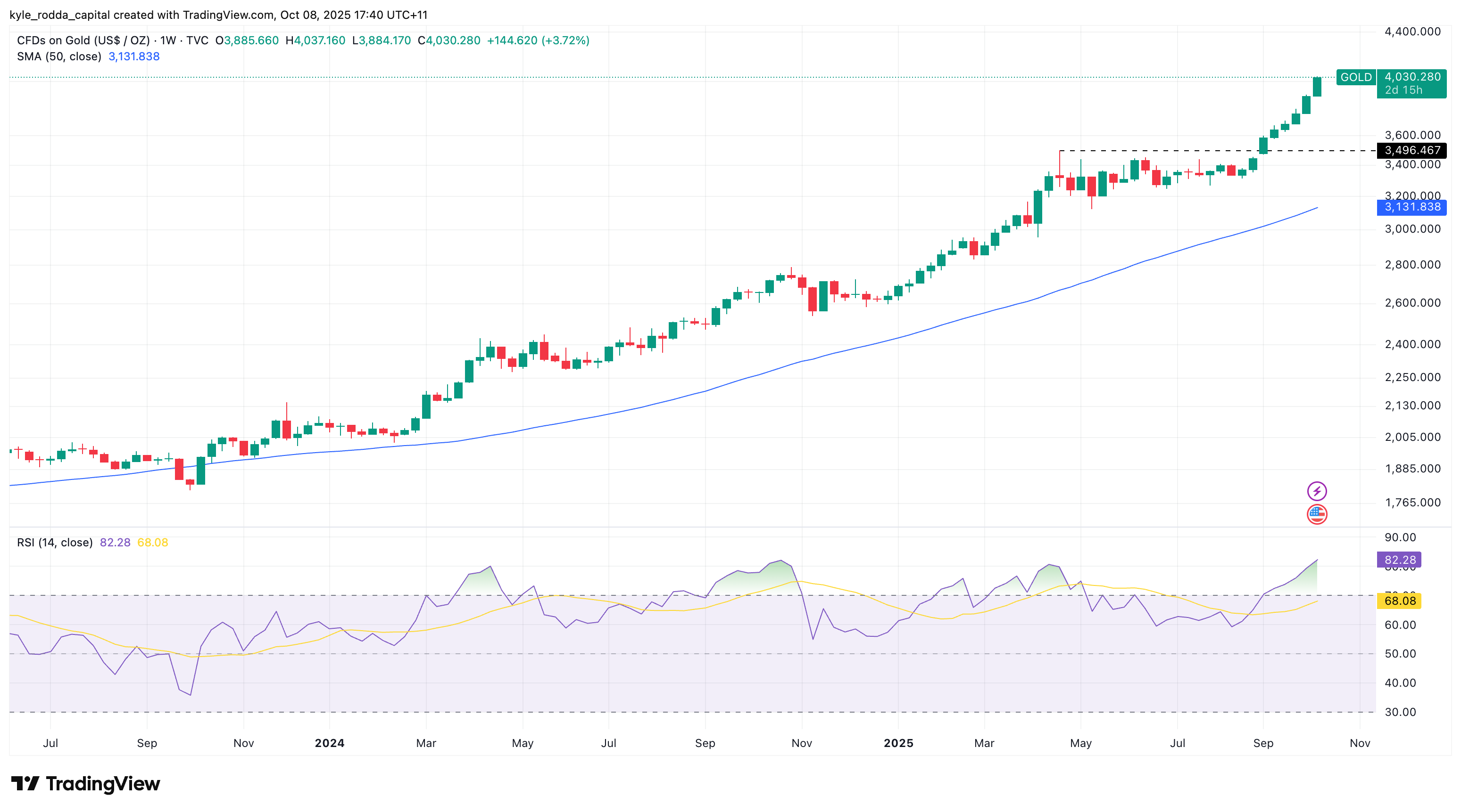 Gold has hit another record high, charging through $US4000 for the first time in history. There are a lot of stories that people tell to explain the movements in gold. The simplest one is that it’s a risk-barometer that goes up when people are fearful. That’s sometimes – but rarely – the case. In the bigger picture, it’s a symptom, for better or worse, of a debt based monetary system. But presently, gold is a five factor trade: