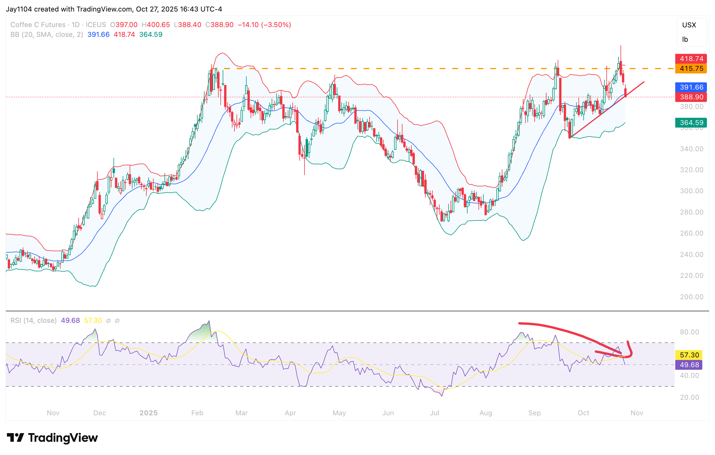 Coffee prices have surged since the beginning of August. However, more recently, they have topped out and struggled to break above $420. After reaching overbought levels and climbing above their upper Bollinger Band for the second time since early September, coffee futures are now trading back below the 20-day moving average and appear to be on the verge of breaking an uptrend that began at the start of September.