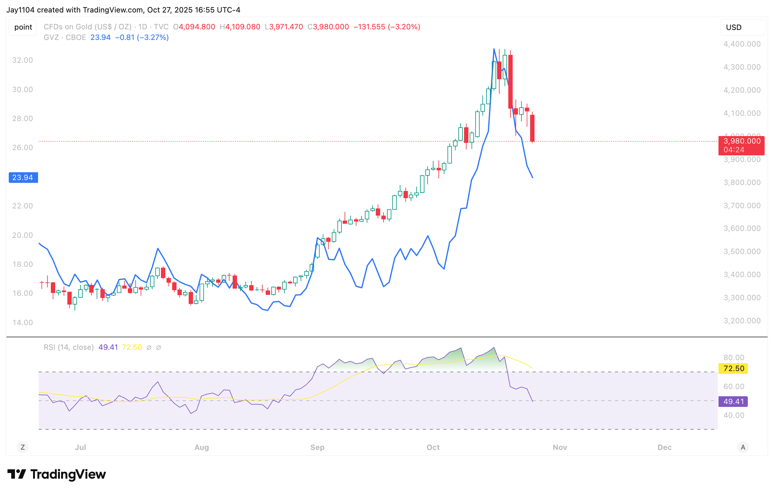 Additionally, the RSI has now slipped below 50, indicating weakening momentum, while downside pressure appears to be accelerating. At the same time, volatility measures for gold continue to decline in a rare spot-down, vol-down scenario, suggesting that the gold rally may, in fact, be in the early stages of unwinding.