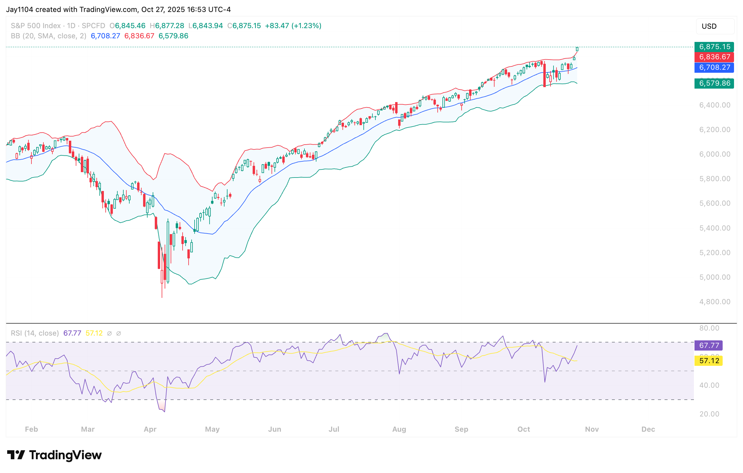 The S&P 500 gap above its upper Bollinger Band, closing the session one full bar entirely above it, something that doesn’t happen very often. This indicates the index is currently overextended and likely approaching overbought territory, though the RSI suggests there may still be room for further gains. At 68, however, it may suggests the move higher is likely quite limited at this stage.