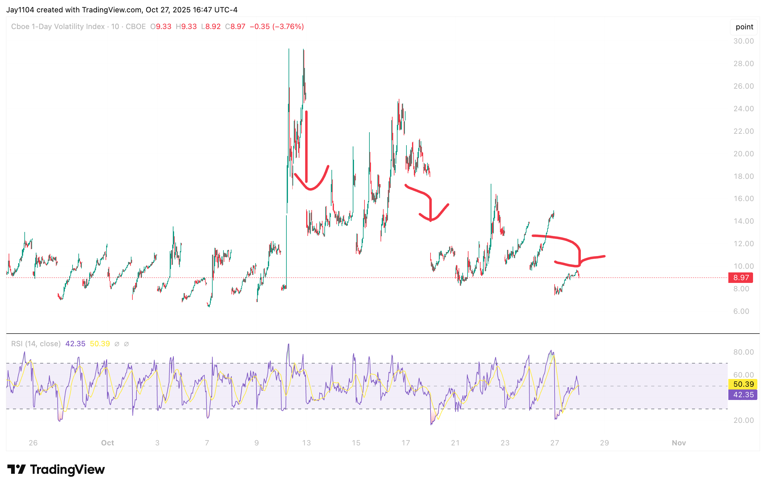 This has now been a similar setup seen on a couple of Mondays in a row. In fact, the same thing happened last week when the VIX 1-Day closed above 17 on the 17th, only to drop to around 10 on the 20th. The same thing also happened on 10 October, when it rose to 25.7 on a Friday, only to open at 14 on the following Monday.