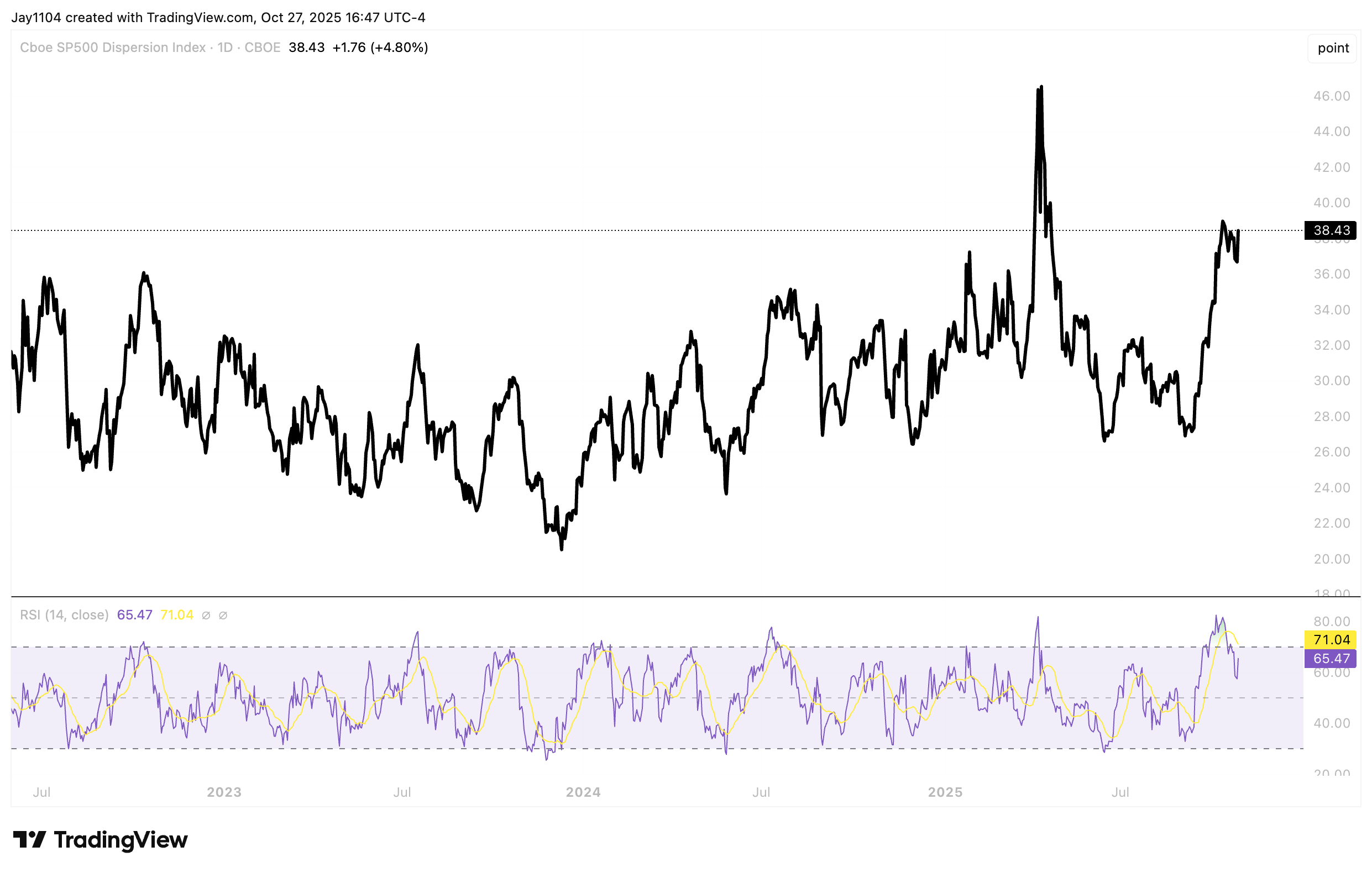 We’ve now seen, on consecutive Mondays going back to the 13th, moves of 1.6%, 1%, and now another move of about 1.2%. The problem is that after Monday, the market hasn’t done much in the days that followed, up until last Friday, which really makes one wonder how much of this move is genuine versus driven by market mechanics. Meanwhile, the S&P 500 dispersion index rose sharply by nearly 5% to 38.5, suggesting that stocks are not moving together but rather in their own distinct directions, another sign of market mechanics at play, perhaps due to earnings season dispersion.