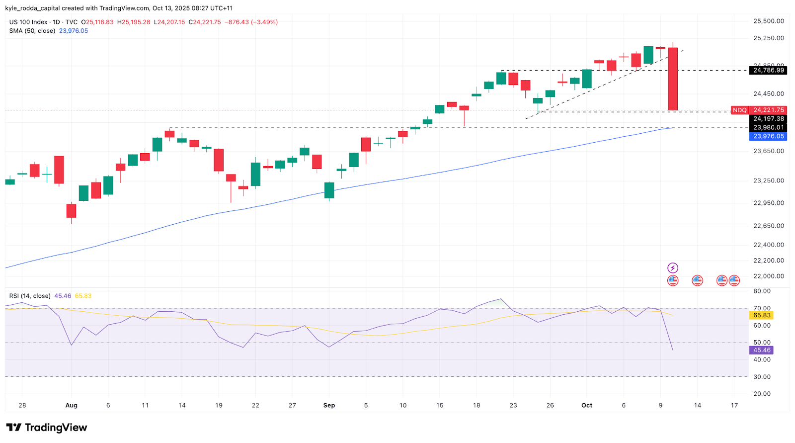 The biggest issue for the market now is whether tit-for-tat tariff threats start again and whether a higher rate – 100% across the board – of tariffs will be implemented on November 1 by the US. It could be this is all brinkmanship and the markets are back to the “TACO trade”, meaning the theatre will be short-lived. Initial price action at the Asia open suggests this could be the case. Even if it is, it could come with a pain that goes beyond the pullback of an overbought and expensive stock market. As was seen after the Liberation Day tariffs, while many imposts were eventually unwound or put on pause, it did result in a material (albeit fairly short) hit to the US economy. The fresh tit-for-tat reintroduces a level of uncertainty that could impact consumption, investment and employment decisions, slowing growth for a period – something that has to be discounted in asset prices.