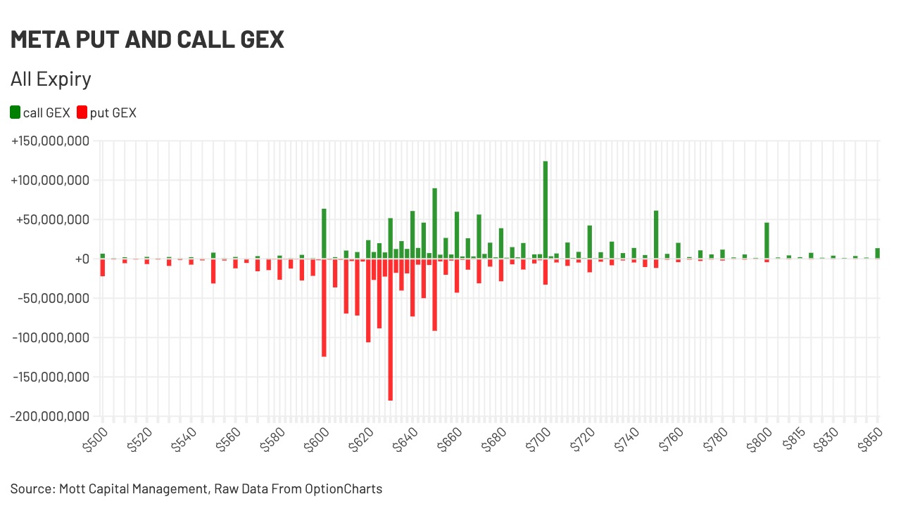 The put gamma level that currently supports Meta sits at the $630 strike price, and if the shares lose that area of put concentration, they could slide further towards $600, the next big area of put concentration.