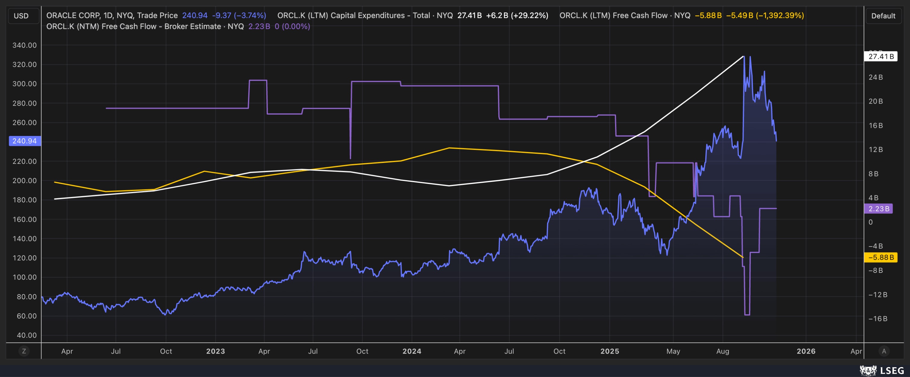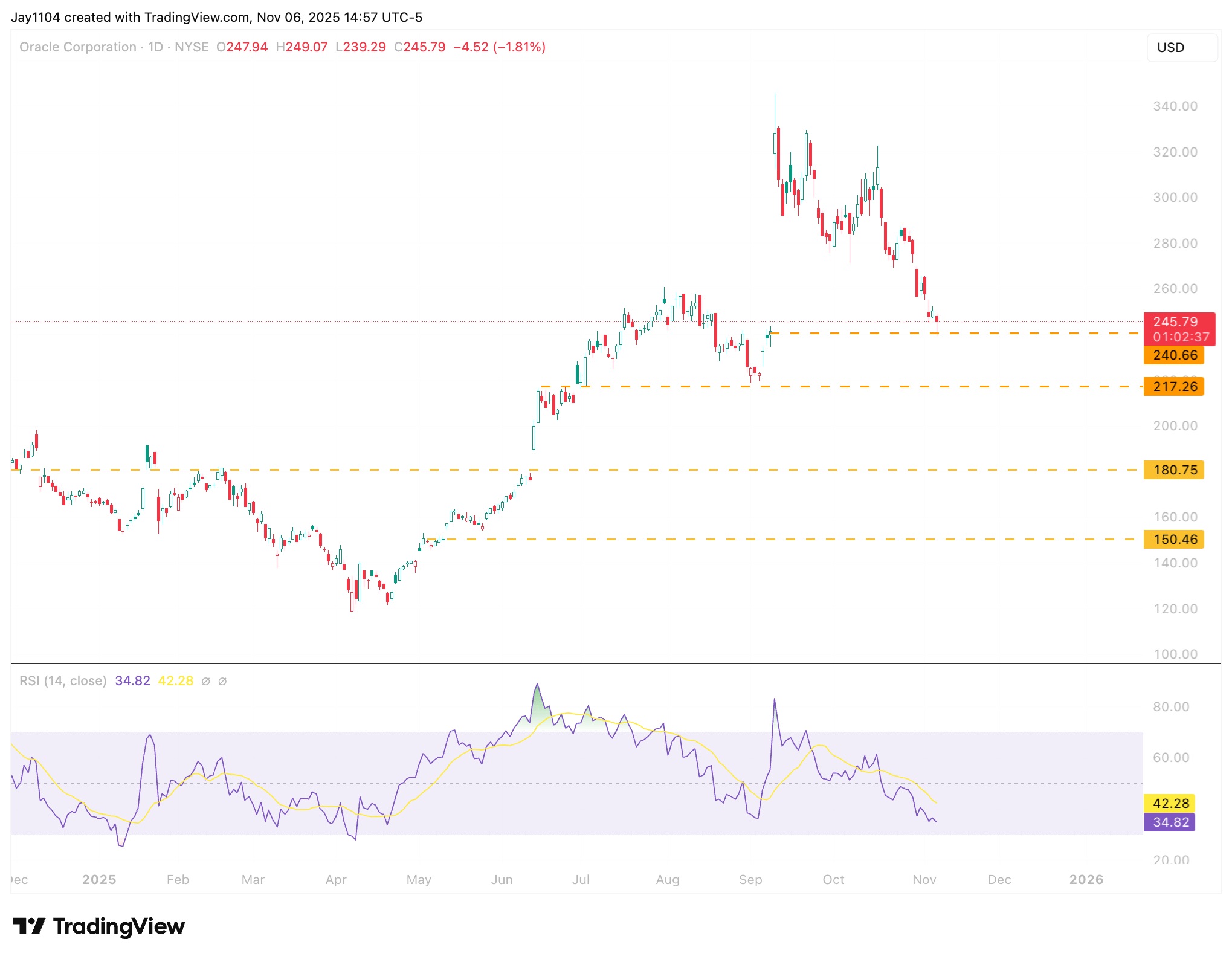 As a result of the increased spending, both stocks have fallen sharply, with Oracle shares plunging, erasing all the gains that followed its earnings report, when the stock surged by 35% in a single day. The question on investors’ minds now is what happens next for Oracle’s share price.