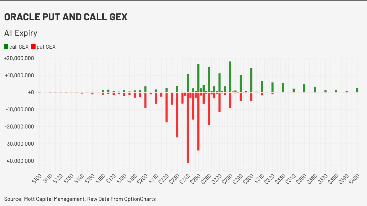 From an options standpoint, a big problem is that the stock is currently in a negative gamma and delta regime, meaning market makers are likely to act as sellers if the stock continues to fall. From an options perspective, the key gamma level sits around $240 per share, an important support level. If the $240 level were to break, it would suggest that, from an options standpoint, support has broken.