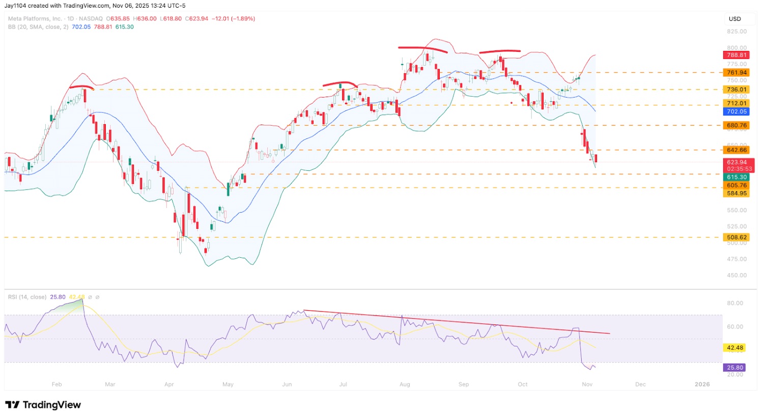 The technical chart shows that the $600 level represents a major area of support for Meta, established on 1 May, when the stock gapped higher amid market turmoil from tariffs. This highlights the importance of that region, as it aligns with support from both an options and a technical perspective. The chart also indicates that the shares are approaching oversold conditions, with the relative strength index falling below 30 and the stock touching the lower Bollinger Band.