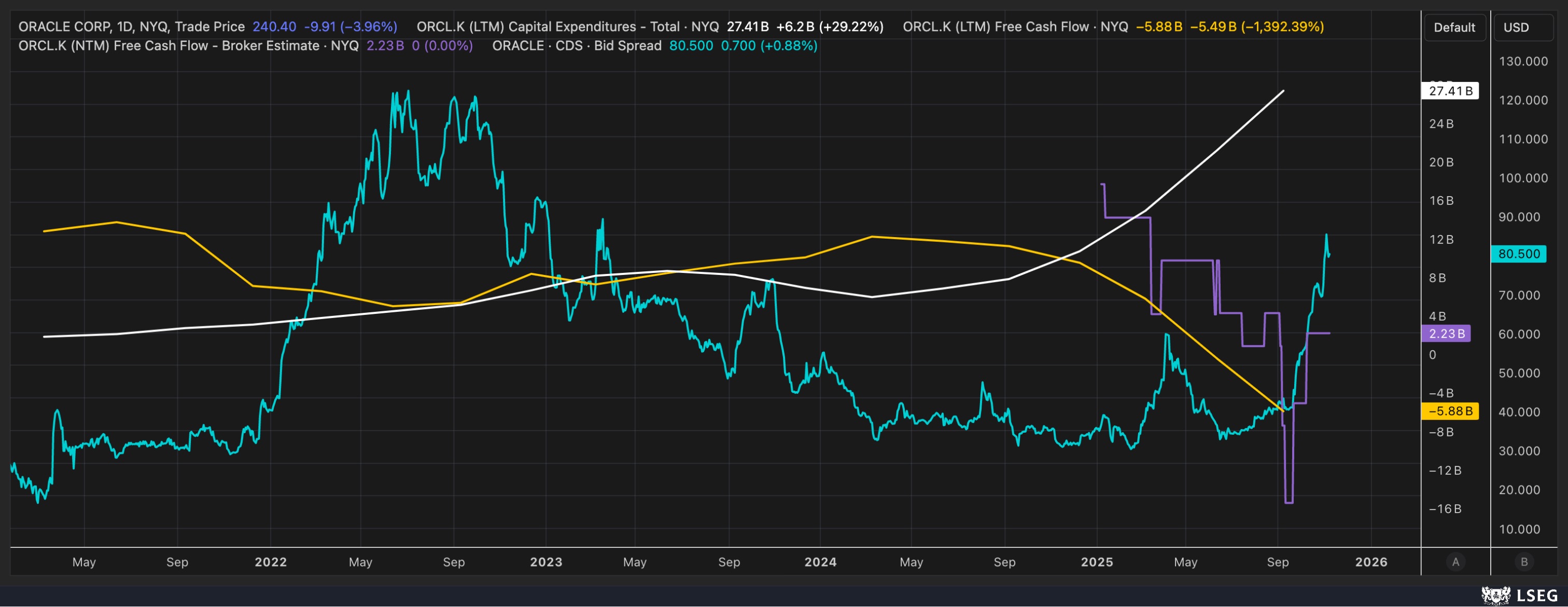 For Oracle, the credit market has woken up to the potential negative impact that AI-related spending is having on the company’s profitability. As a result, its credit default swap has widened to around 80 basis points. The spread has not been this wide since late 2022 and early 2023, during the Federal Reserve’s tightening cycle, when high inflation and rising interest rates triggered market fears of a potential recession. The widening of the CDS appears to coincide with Oracle’s declining free cash flow.