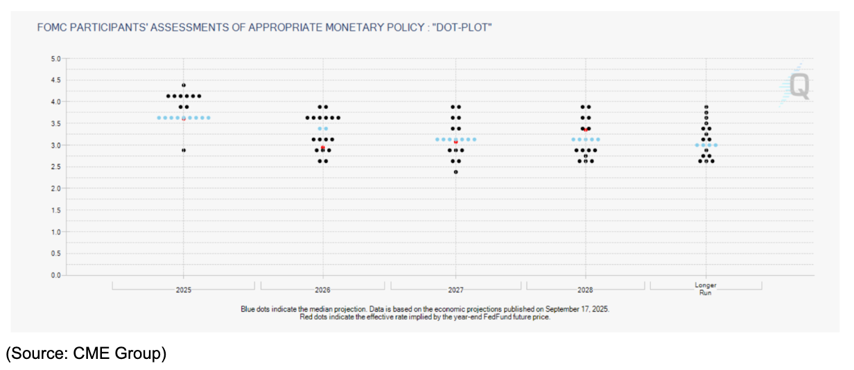 The FOMC is all but certain to cut interest rates at this meeting, with the markets pricing in a near 100% implied probability. It's also expected to be a humdrum event, with the implied move for the S&P500 tomorrow barely 1%. That's low for a Fed day but similar to what was discounted and transpired at the central bank's last decision. There's no updated forecasts at this meeting, so the interest is in the guidance provided by Chairperson Jerome Powell at his press conference. A lot of dovishness is baked into the curve, with a cut in December almost fully discounted and a Federal Funds Rate of sub 3% implied for next year. Anything that upsets that pricing could lead to volatility. However, with the Fed focussed on the labour market side of its mandate, despite sticky inflation, not to mention a vacuum of data because of the US Government shut down, Chair Powell may play a straight bat. That means not validating the market's pricing, but not pushing back on it either.