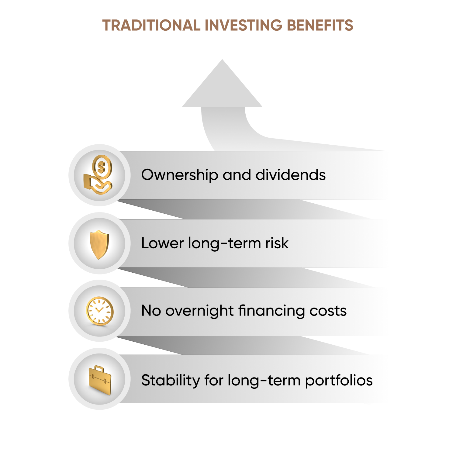 - Traditional investing may be more appropriate if you prioritise capital preservation, prefer unleveraged exposure and focus on long-term goals rather than short-term price changes.