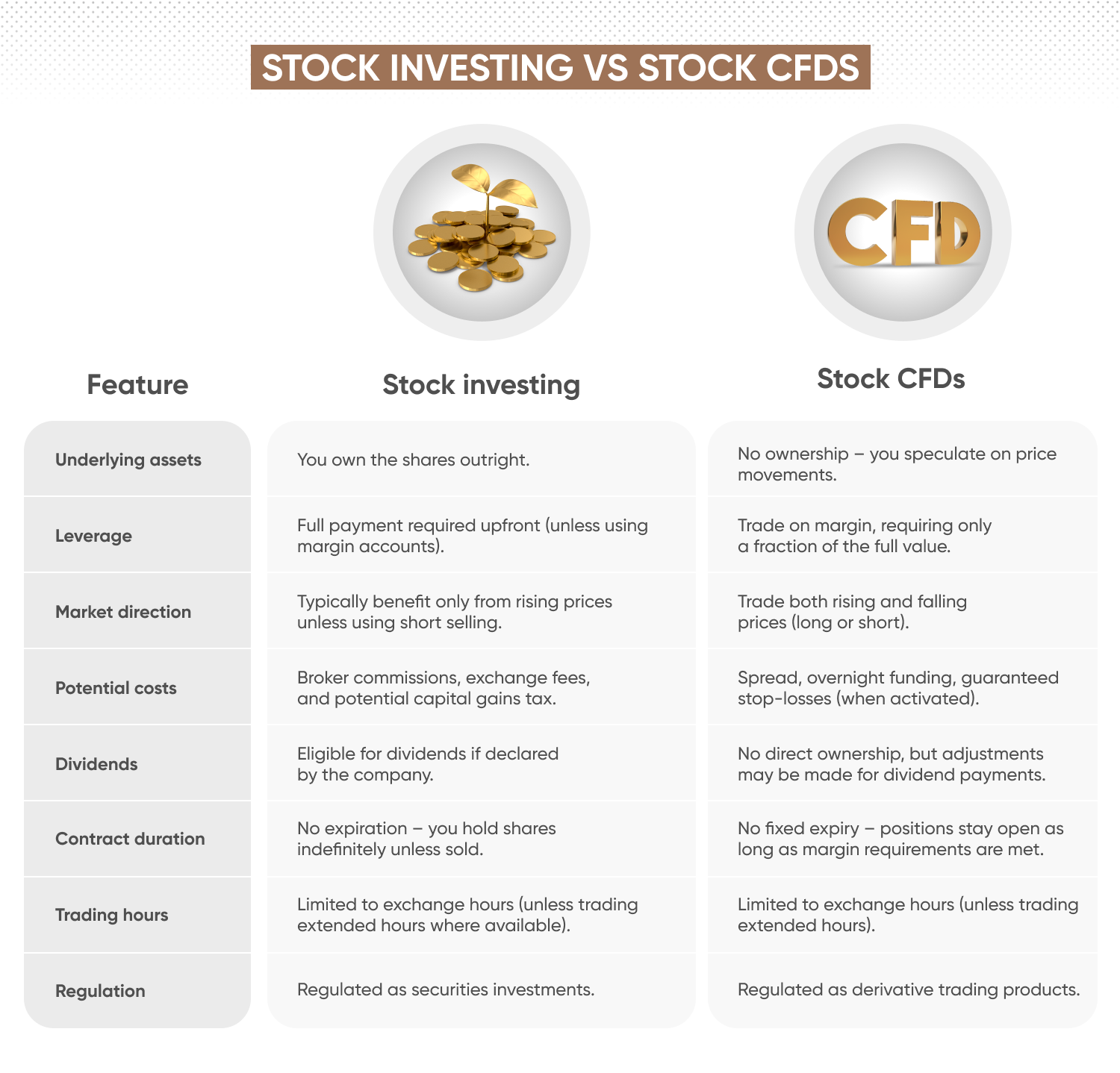 CFDs (contracts for difference) and stocks (shares) trading are often compared, but they’re quite different as concepts. CFDs are instruments that offer access to various markets, including forex, commodities, and indices, while stocks are focused solely on the performance of listed companies through shares trading.