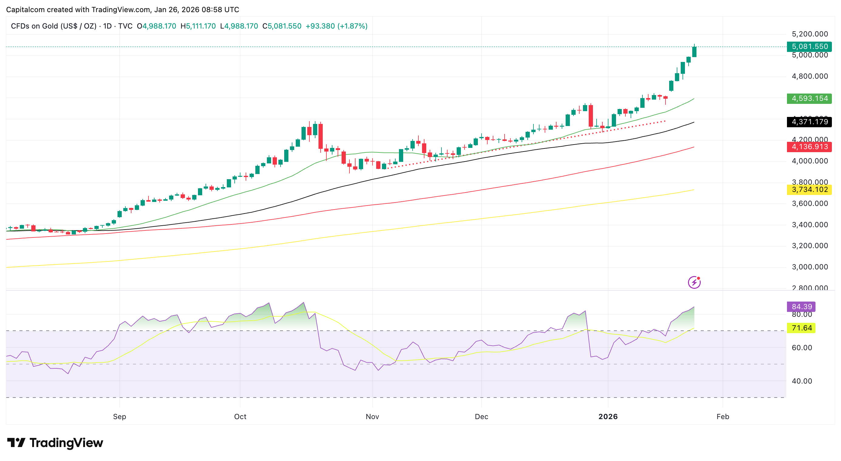 The advance in gold has been driven by a familiar but intensifying mix of forces. Persistent geopolitical tension, growing concerns over US fiscal sustainability, and repeated attacks on central bank credibility have kept demand for hard assets elevated. At the same time, real yields have struggled to rise meaningfully despite bouts of risk-on sentiment, limiting one of gold’s traditional headwinds. The result has been a sustained bid for bullion that appears increasingly detached from short-term macro data and more anchored in structural distrust of fiat systems.