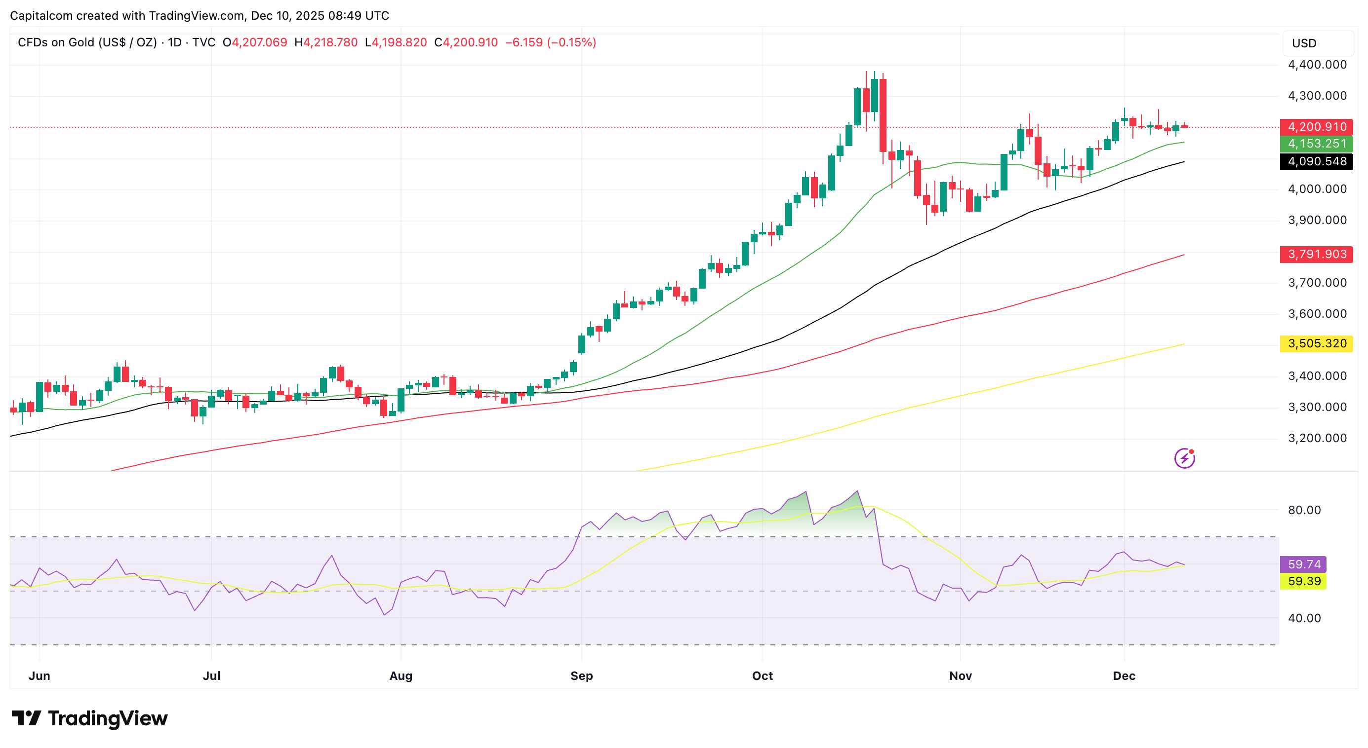 Gold has traded broadly flat over the past week as investors position ahead of the Fed announcement. A dovish outcome could reinforce expectations for lower rates into 2026—potentially bringing the policy rate closer to 3% by year-end—and may provide the catalyst for XAU/USD to decisively break above the $4,250 resistance zone, which has capped prices in recent weeks. A breakout would shift focus toward the all-time highs above $4,380, though momentum indicators such as the RSI may begin to approach overbought levels depending on the strength of the move.