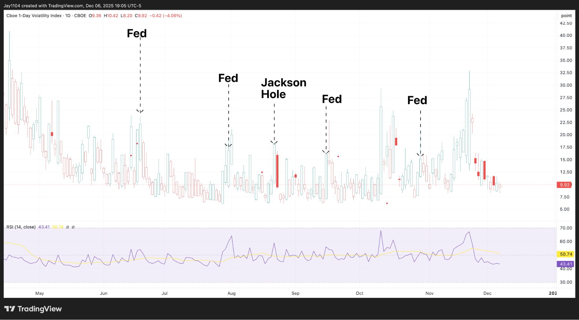 Because of this uncertainty and the unpredictability surrounding some of the meeting’s nuances, S&P 500 implied volatility levels will likely be elevated heading into the event. The best gauge for this day-to-day volatility is the VIX 1-Day, which finished the week around 9.9. That is a very low reading, and we have been focused on the decline in implied volatility since before Thanksgiving. At this point, it appears that very short-dated implied volatility has, for the most part, reached a bottom. As we move through the week, implied volatility as measured by the VIX 1-Day could begin to creep higher into the meeting, ultimately peaking around 2 p.m. Eastern on 10 December when the news is released, before potentially collapsing once the press conference begins at around 2:45 to 3 p.m. Eastern.