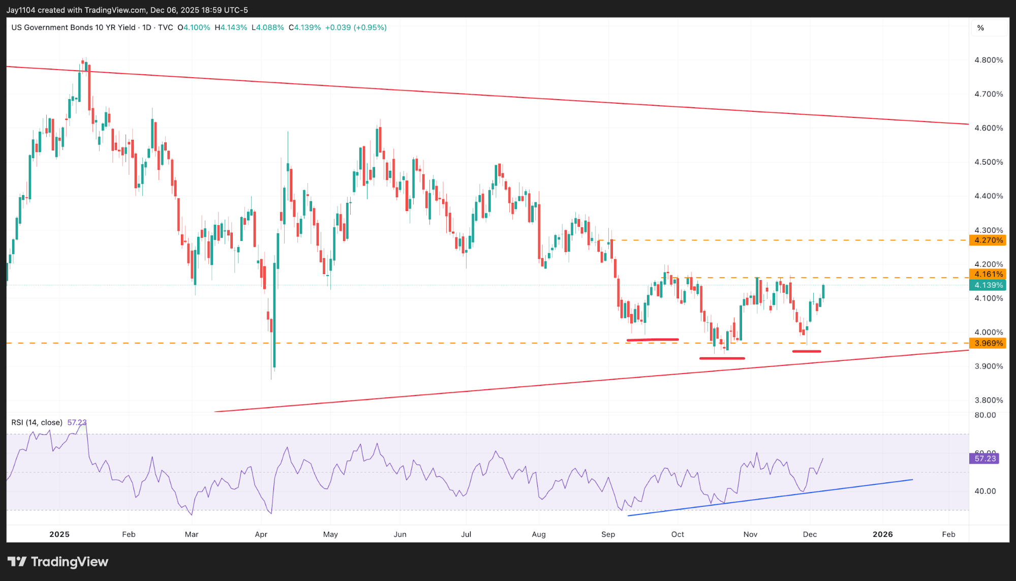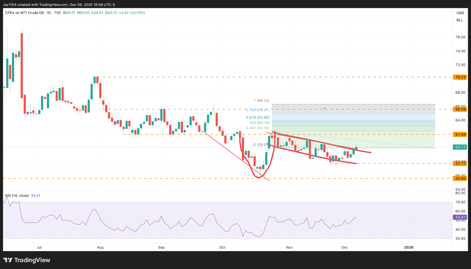 Oil may also be playing a key role in the 10-year rate rise, given the strong correlation between oil prices and long-end Treasury yields. Oil may finally have broken out of the downtrend noted a couple of weeks ago, moving above $60 and, more importantly, breaking its descending channel. In fact, oil may have formed a bullish continuation pattern known as a cup-and-handle. A breakout could suggest a move towards the $65.50 level. If oil manages to clear this resistance, the price could edge closer to $70 – a shift that may add upward pressure to long-end rates.