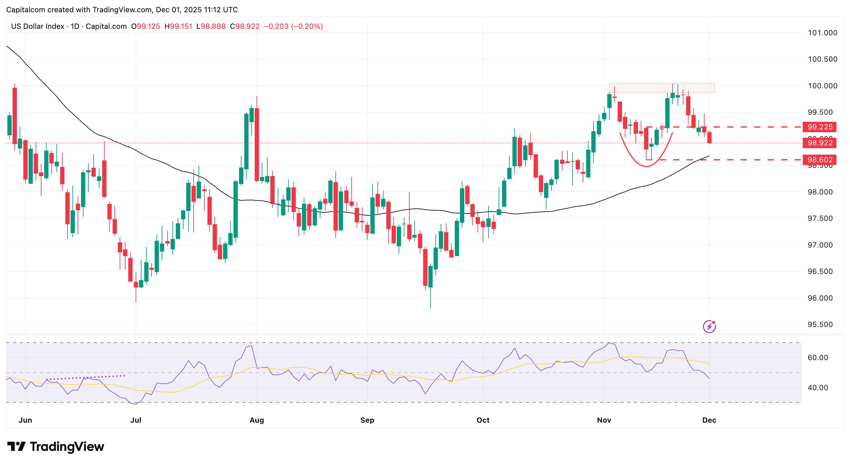 The dollar index has notably rejected the 100 level and broken below a rising support trendline—raising questions about the durability of the recent USD recovery.